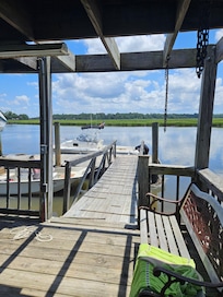 Beliggende inden for 15 minutter fra smukke historiske Beaufort, 15 minutter fra Parris-øen og 45 minutter fra strandene på Hunting Island og Hilton Head, har denne flugt ved havnen 1 soveværelse med ensuite boblebad og bruser, et 2. soveværelse med ensuite og 1 tredobbelt soveværelse, tre fulde bade, en vidunderlig afskærmet veranda og smuk sol stiger op fra vores dybt vand dock. Krabbe, rejer og fisk lige fra kajen. Slap af på det overdækkede dæk over vandet, mens du ser på delfiner og stingray sammen med nogle ekstraordinære fugleliv, herunder Kraner, Heroner, Pelicans og Egrets. Medbring din kajak, paddle board og små håndværk og nyd McCalley Creek! Tag en tur fra kajen til Hilton Head Island eller Beaufort ved bugten for noget shopping og spisning i dit lille håndværk. Hjemmet er centralt beliggende mellem Savannah og Charleston. Dette er en god balance mellem fredeligt land og adgang til Beaufort centrum. Om natten kan du nyde den smukke udsigt over vores sydlige måne. Brug gasgrillen på den udendørs terrasse, eller slap af i den afskærmede veranda.