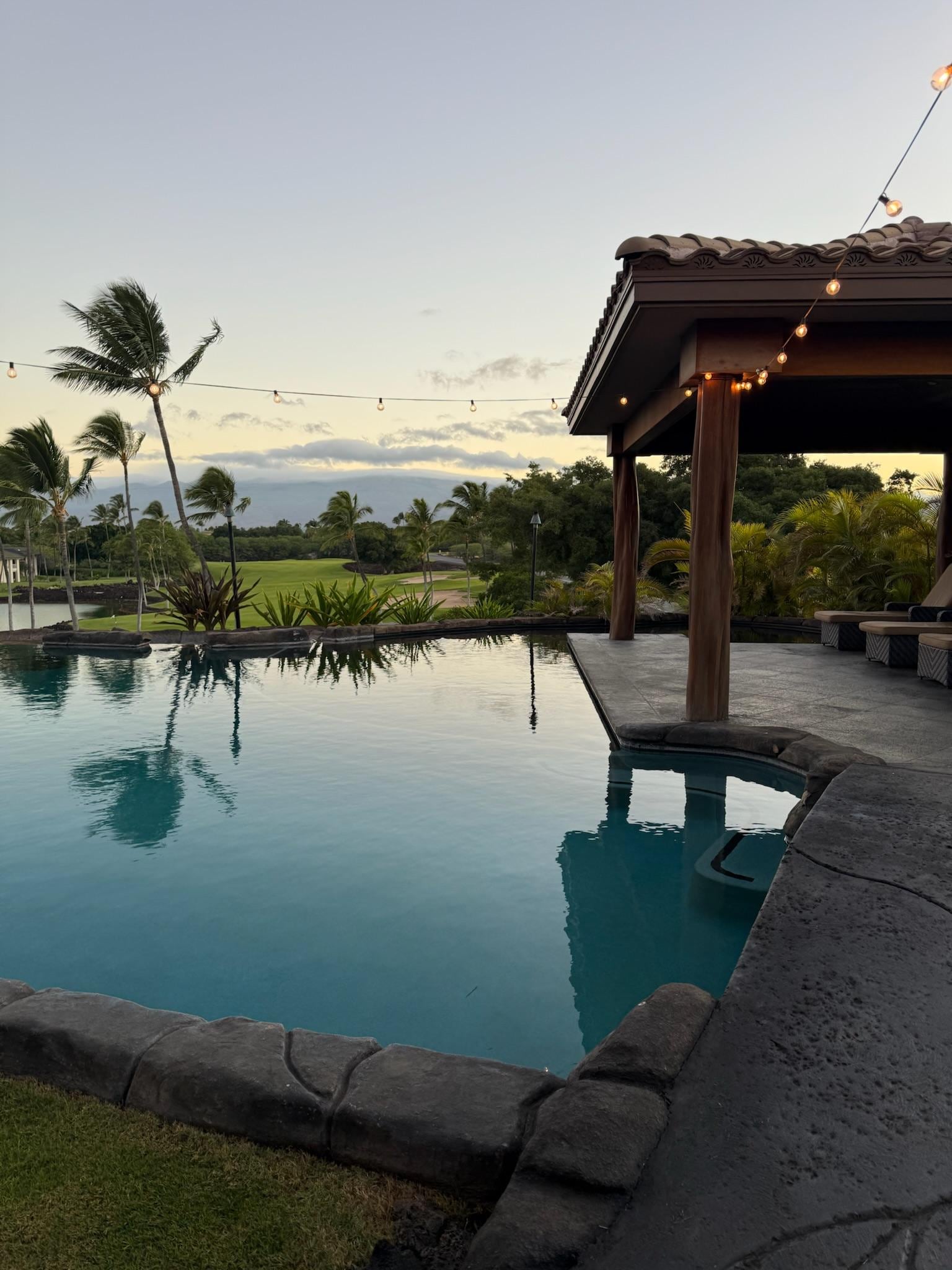 From the pool deck you can gaze out over the sprawling green golf course and the clear blue-green ocean in the distance or take in the stunning peaks of 5 volcanic summits to the east. Dive into estate's namesake blue lagoon pool, or to slip into the relaxing spa for a night-time bubble massage under the stars.