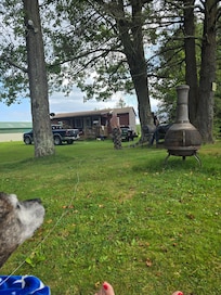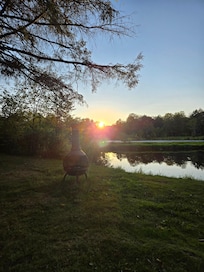 The cabin was newly constructed in 2006 and has two bedrooms. One bedroom has a queen-size bed, the other contains a full-size bed with a bunk overtop. The living area has a full-size futon and full-size sofa sleeper as well. The kitchen is modern and is equipped with all the necessities. The bathroom is also modern and contains an over-sized shower with new modern flooring. The cabin has electric heat, A.C., dish television, verizon cell phone service, and a small electric wood like stove to enjoy. A covered back porch overlooks the pond. Along side the pond there is a fire pit and outdoor lawn furniture. Property has a large charcoal grill for guest use.