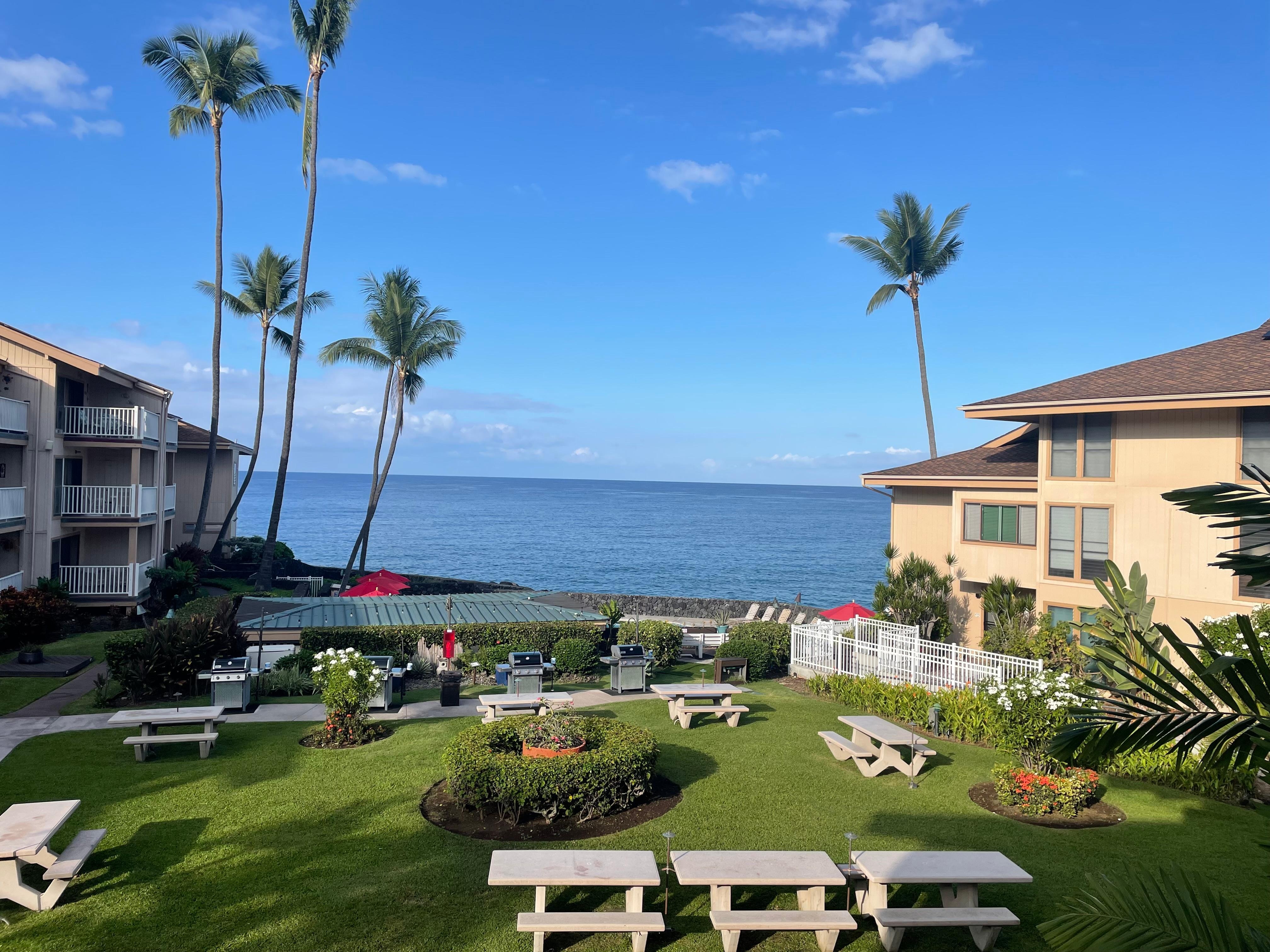 Newly renovated Two Bedroom Two Bath Condo with Full Ocean View in Center of Complex on 2nd Floor on the Kona Coast. Corner Unit Wifi equipped Ceiling Fans Portable Air Conditioner in living room Enjoy Dophins spinning and whale watching in season Washer and Dryer in Unit Complex provides Pool, Spa and Barbecues Equipped with one Queen bed and two Twins that can be converted to a Queen and also a Sofa Bed in living room Close drive to town. Ocean Front Pool. Beaches nearby. Snorkeling and water activities are abundant. Hiking Volcanos and by Waterfalls. PLEASE NOTE THAT THIS IS A NON SMOKING COMPLEX!!!!!