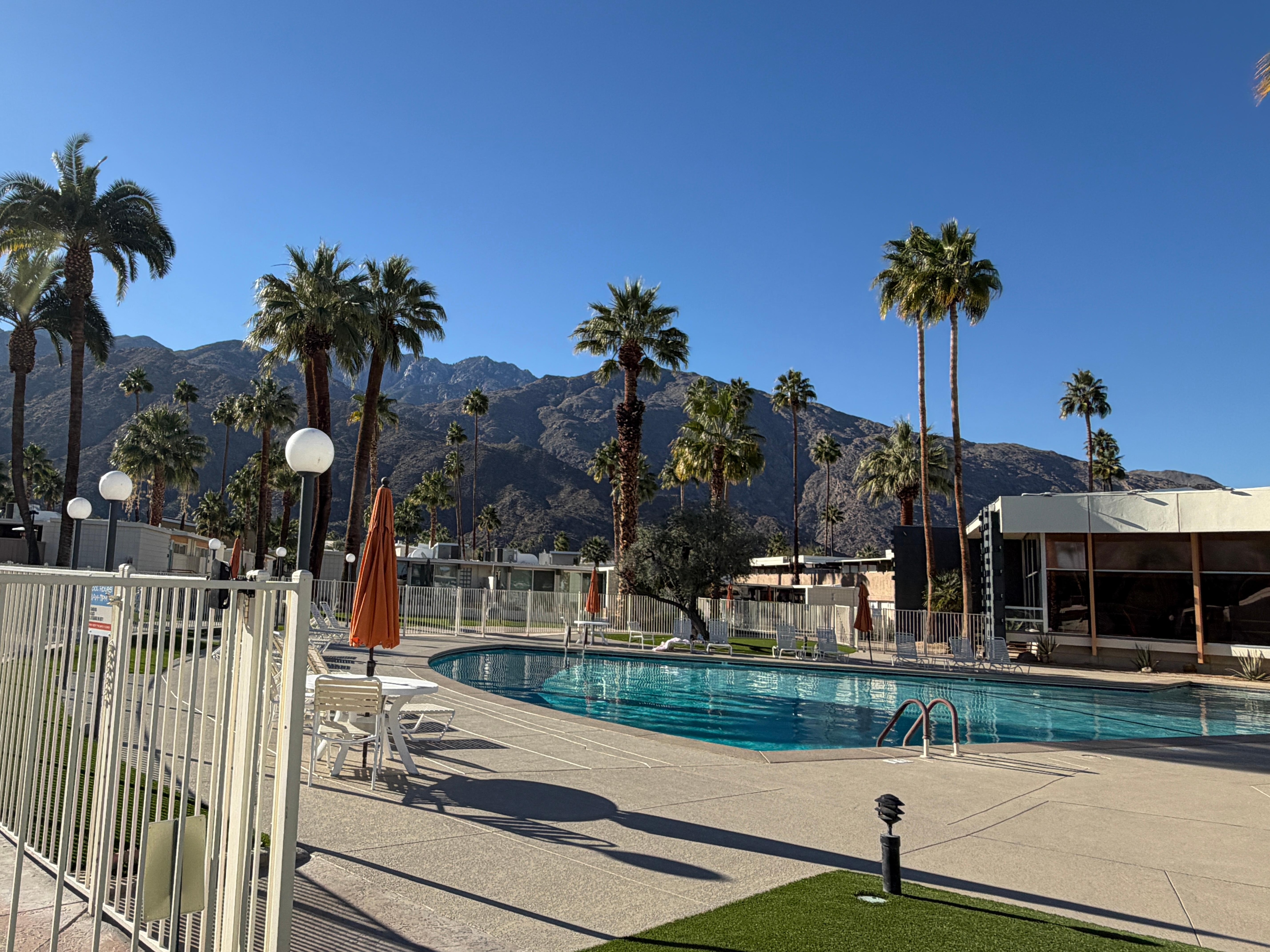 The grounds of the Ocotillo Lodge feature a champagne cork-shaped, heated swimming pool said to be the largest in the entire Coachella Valley. There are also two large, heated spas with outdoor BBQ lounge area, the famous Tiki-style Sunshine Bar where Don Ho would sing his tunes, community laundry and much more. The clubhouse is currently under renovation but the fitness center is open. Enjoy your own private slice of Palm Springs Glamour right here at the Ocotillo Lodge.