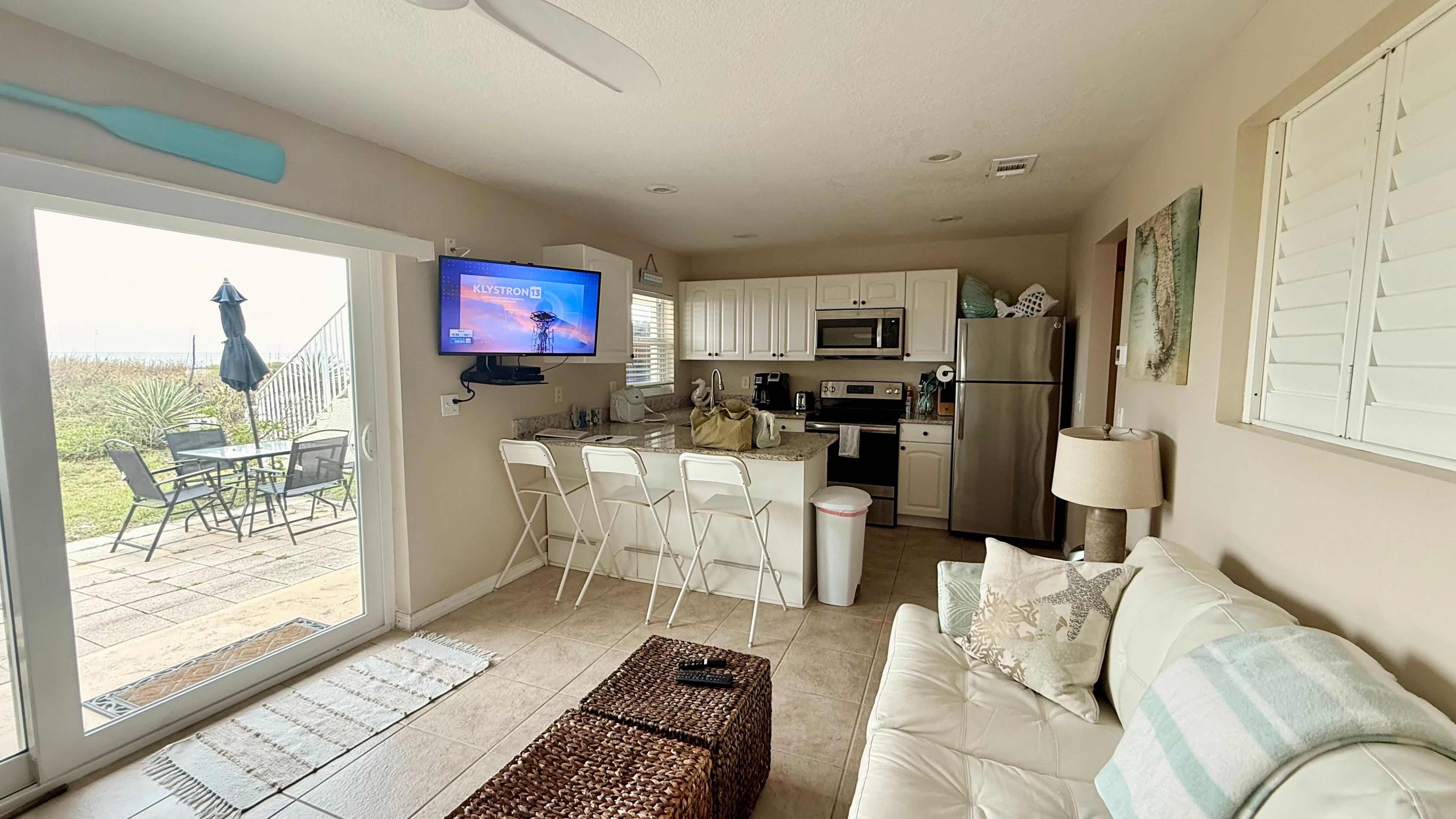 Gorgeous one bedroom oceanfront condo located in the heart of downtown Cocoa Beach. Walking distance to restaurants and entertainment. Recently remodeled with new appliances and granite counter top. Equipped with full size kitchen (has everything you need to cook), sleeper sofa, HDTV with cable in living room and bedroom, wifi, and central air conditioning. Enjoy relaxing on the patio with beautiful views of the ocean. Full size washer and dryer inside the unit.