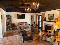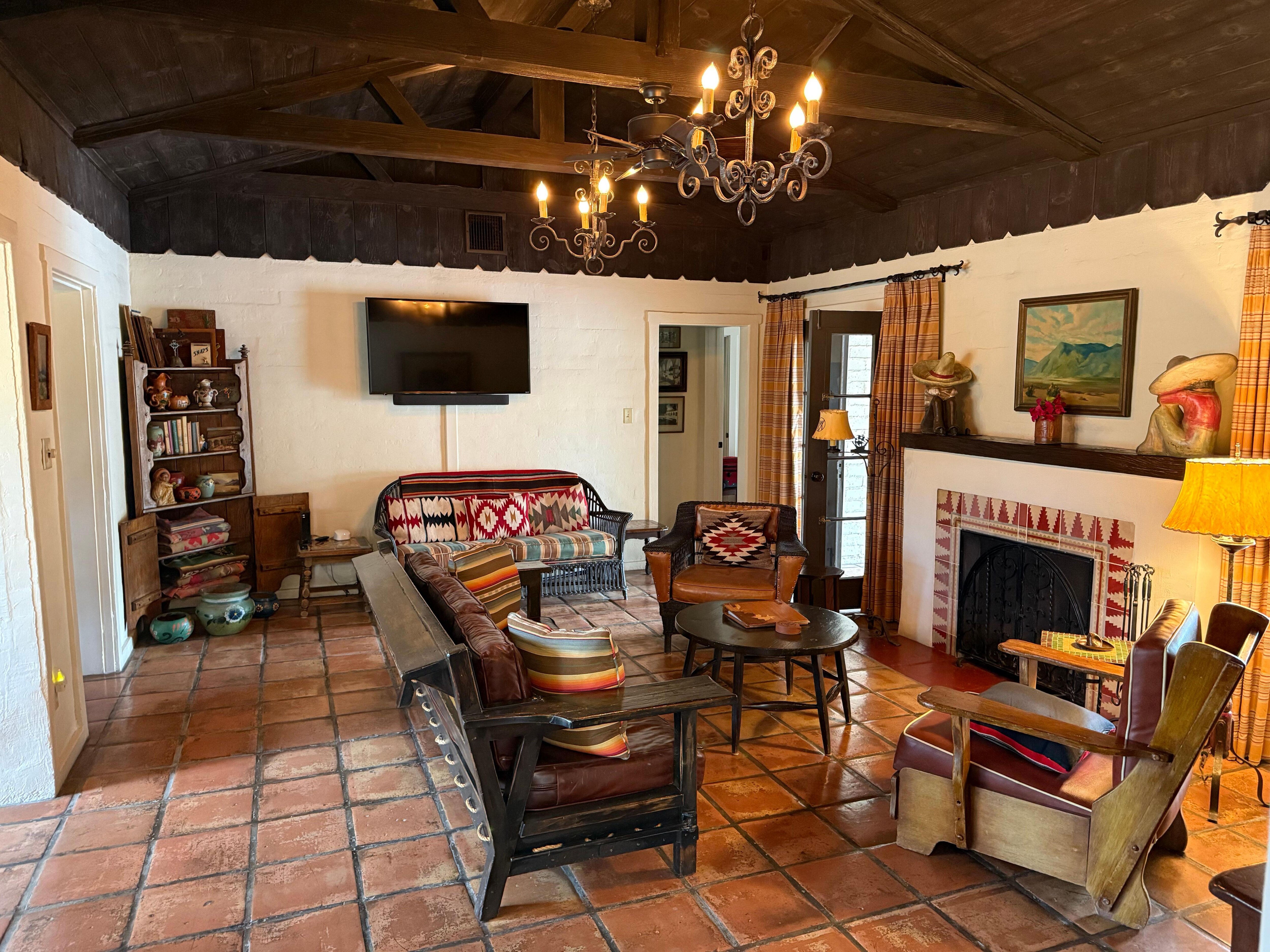 The living room features a wood-burning fireplace with a French door leading to the covered patio, pool, and backyard. The large screen 48" Smart TV equipped with Roku, Hulu, free Netflix and Amazon Prime. If you prefer to get back to basics, you can enjoy our book library and a vast array of board games.