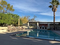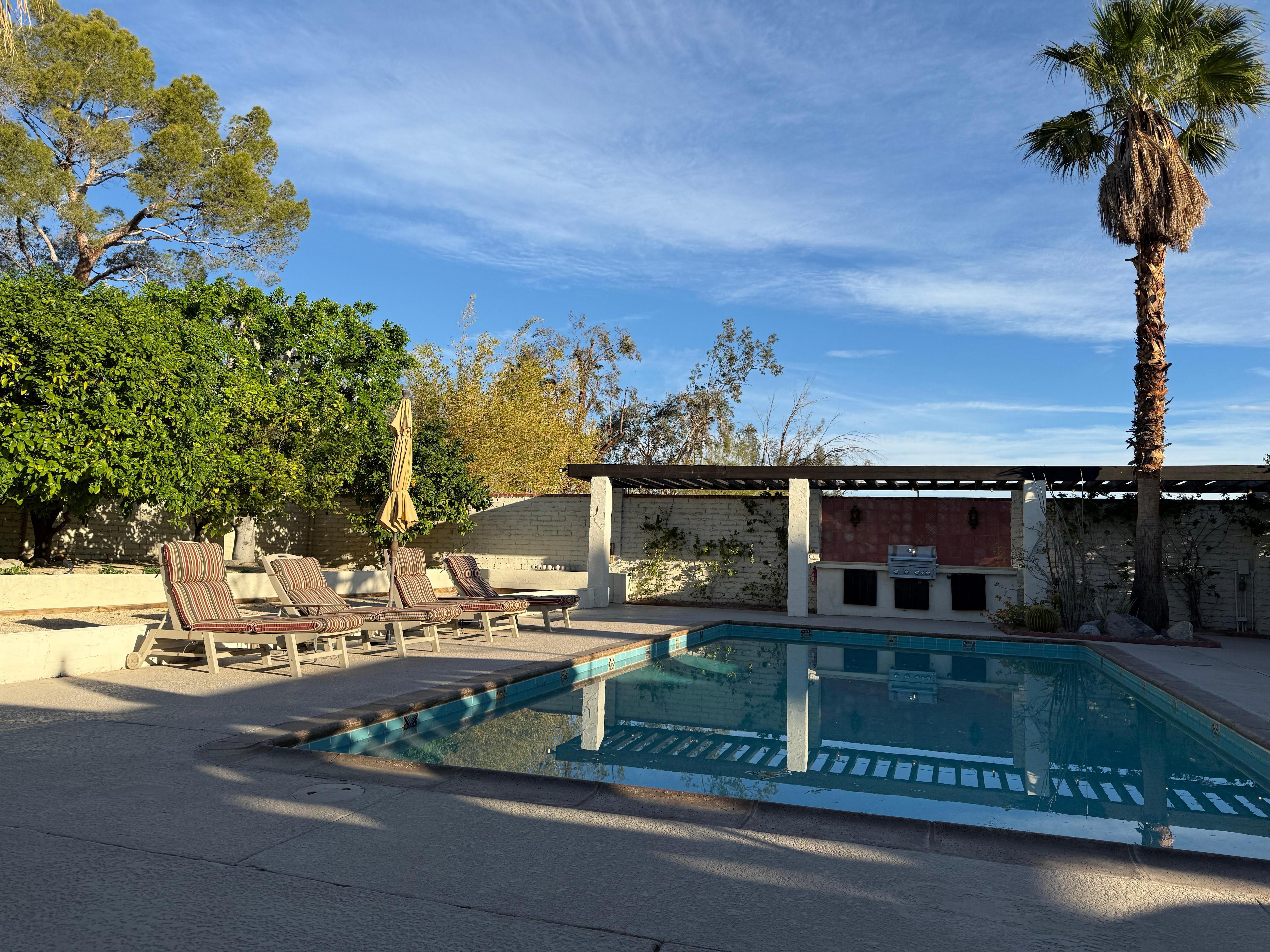The west-facing backyard and newly remodeled saline (salt) water pool are totally private with beautiful mountain views and a splashing water fountain. Enjoy the spectacular sunsets while sitting under the grapevine-lined arbors, grilling on the large Jenn-Air built-in BBQ, floating in the pool or relaxing with a refreshing drink. The citrus orchard containing orange, grapefruit, tangerine, lemon and limes provides our guests with fresh seasonal fruit. The covered patio contains a sofa, chairs and a table for intimate outdoor dining. There is an additional umbrella-covered dining table for larger groups. There are numerous cushioned chairs and chaise lounges for relaxing in the sun.
