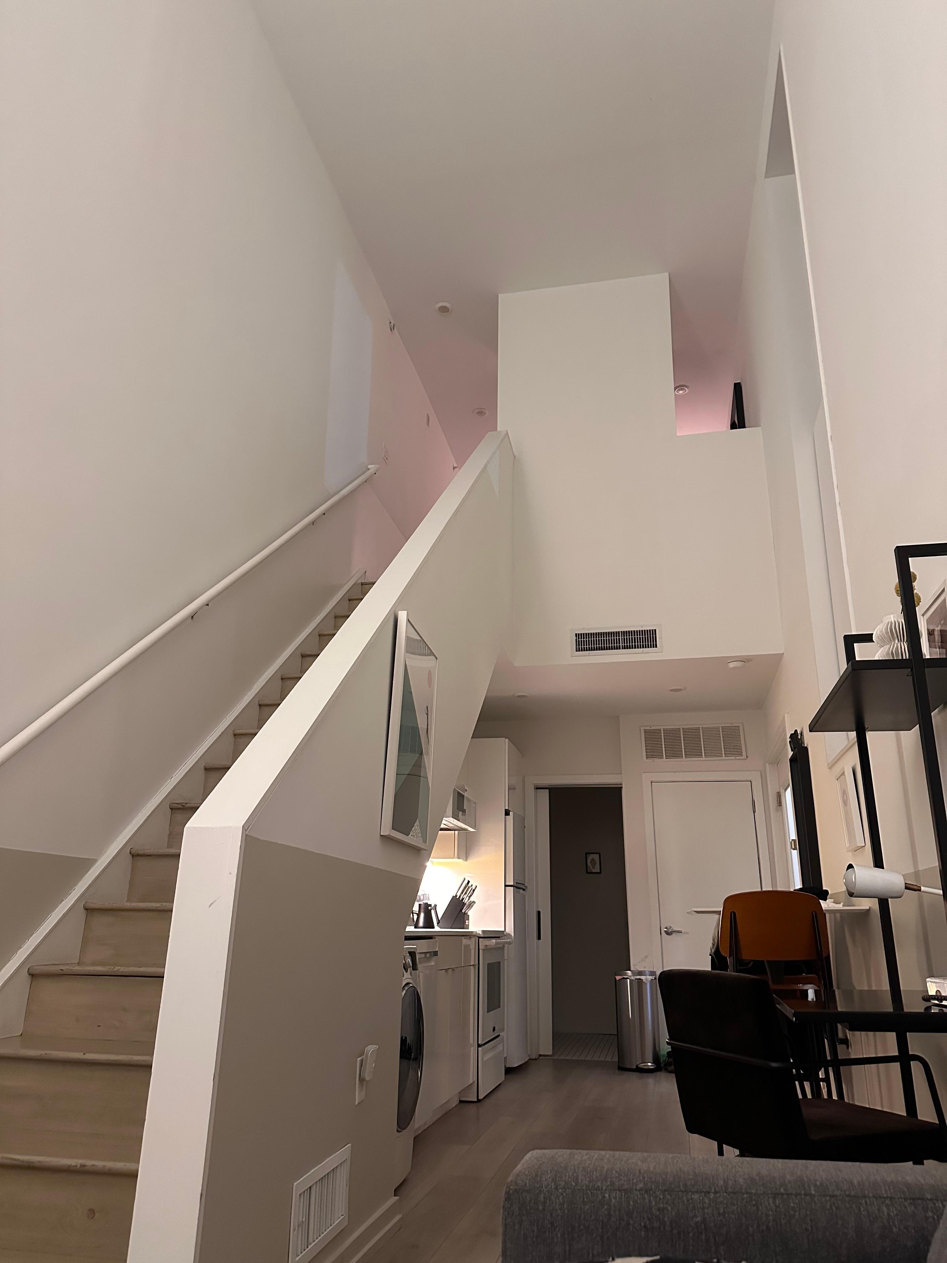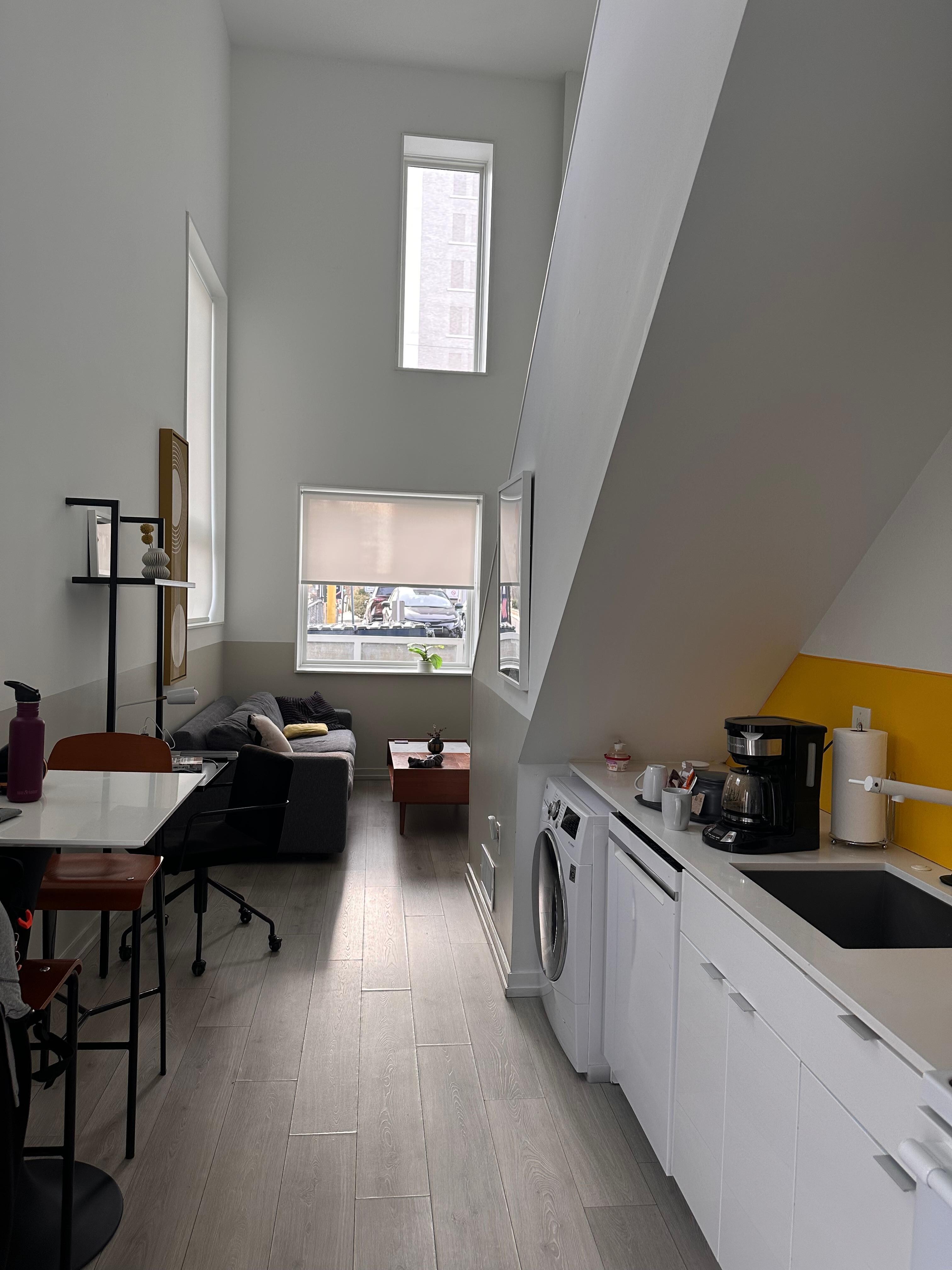 The Space: This home is a street-level access with two levels within the apartment. The living room, kitchen, and full bathroom are located on the first (ground) floor, and the bedroom is located in the upper loft area within the home.