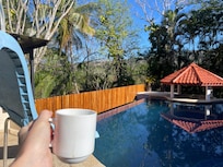 Our home is centrally located in the small fishing town of Puerto Carrillo. It is walking distance to the local tiendas (groceries), restaurants, pizzerias, cafés Ko, and of course THE beautiful beach. Carrillo Beach was rated among the top 25 hideaway beaches in the world in Travel and Leisure magazine. Samara is the next beach town 10 minutes away and provides more shopping, restaurants, surfing and adventure tours. Playa Carrillo is one of the most desirable beaches in Costa Rica. This 2-mile long white sand beach is lined with palm trees that provide plenty of shade. And, is void of commercial development. No bars, no hotels, no restaurants, just like its supposed to be with a few locals selling coconut milk or a push cart with sno-cones. Many mornings you can walk the entire beach and see only a handful of people. Carrillo’s horseshoe bay is protected from the rolling Pacific waves by a coral reef which is available for snorkeling at low tide. The waves are usually very playful with no undertow, making it perfect for all ages. Surfers looking for bigger waves can go to Camaronal, the next beach south. Returning from the beach, you can rinse off in the outdoor shower and relax in our private infinity pool. The pool includes a swim up palapa bar with a mini-fridge for drinks and a gas barbeque grill. There is also a cool water Jacuzzi and a waterslide for kids of ALL ages.