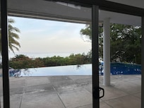 On the same level as the first floor is the pool deck which overlooks the ocean. It features a trapezoidal swimming pool with a double infinite edge plus deck chairs, loungers, table,and grill. Monkeys and birds visit the pool on a regular basis. On the lower level is a gym and ping pong room.