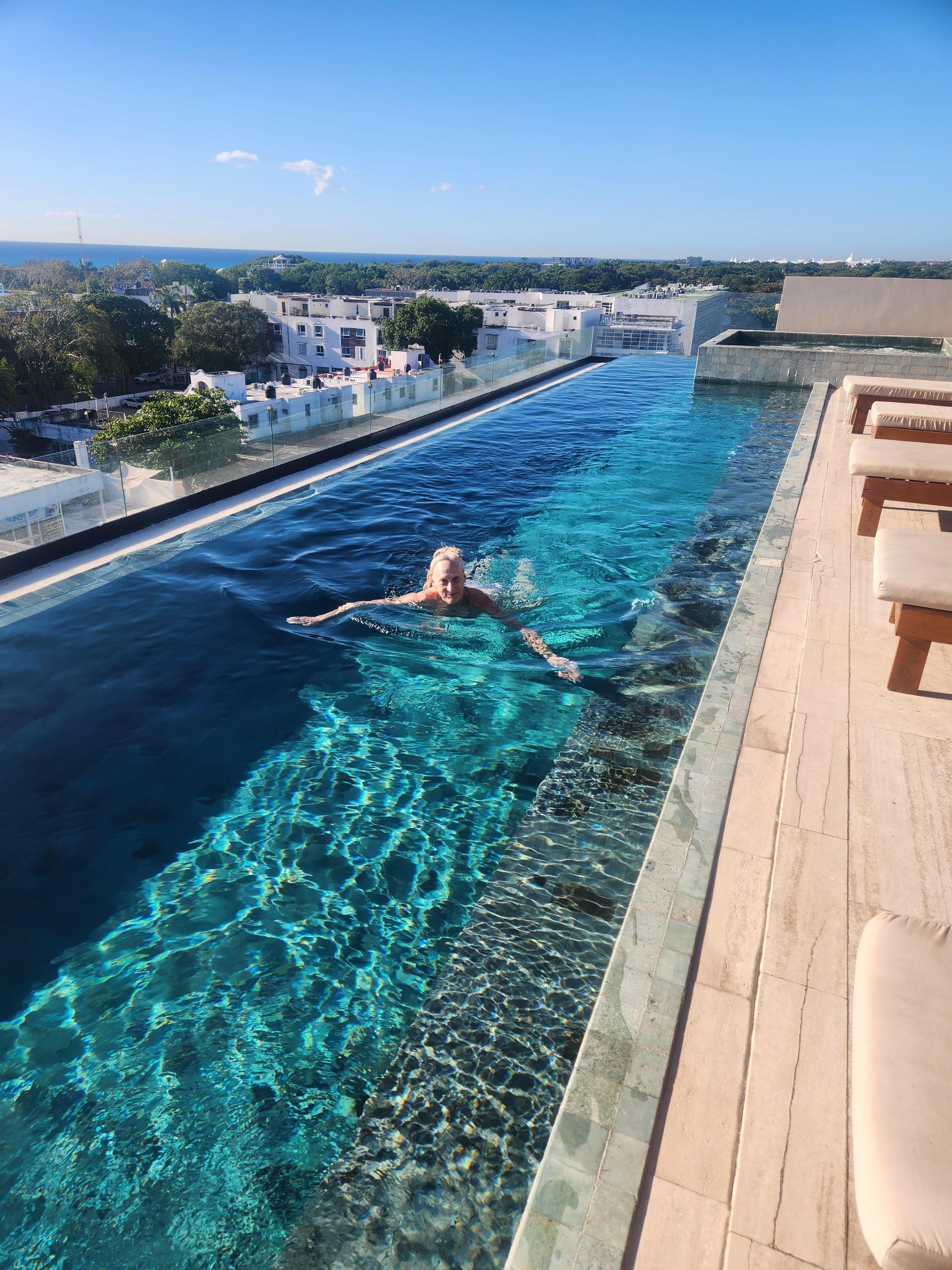 The rooftop area has plenty of tables and sunbeds. The infinity pool provides spectacular views of the ocean and the jacuzzi is equipped with jets and warm water.
