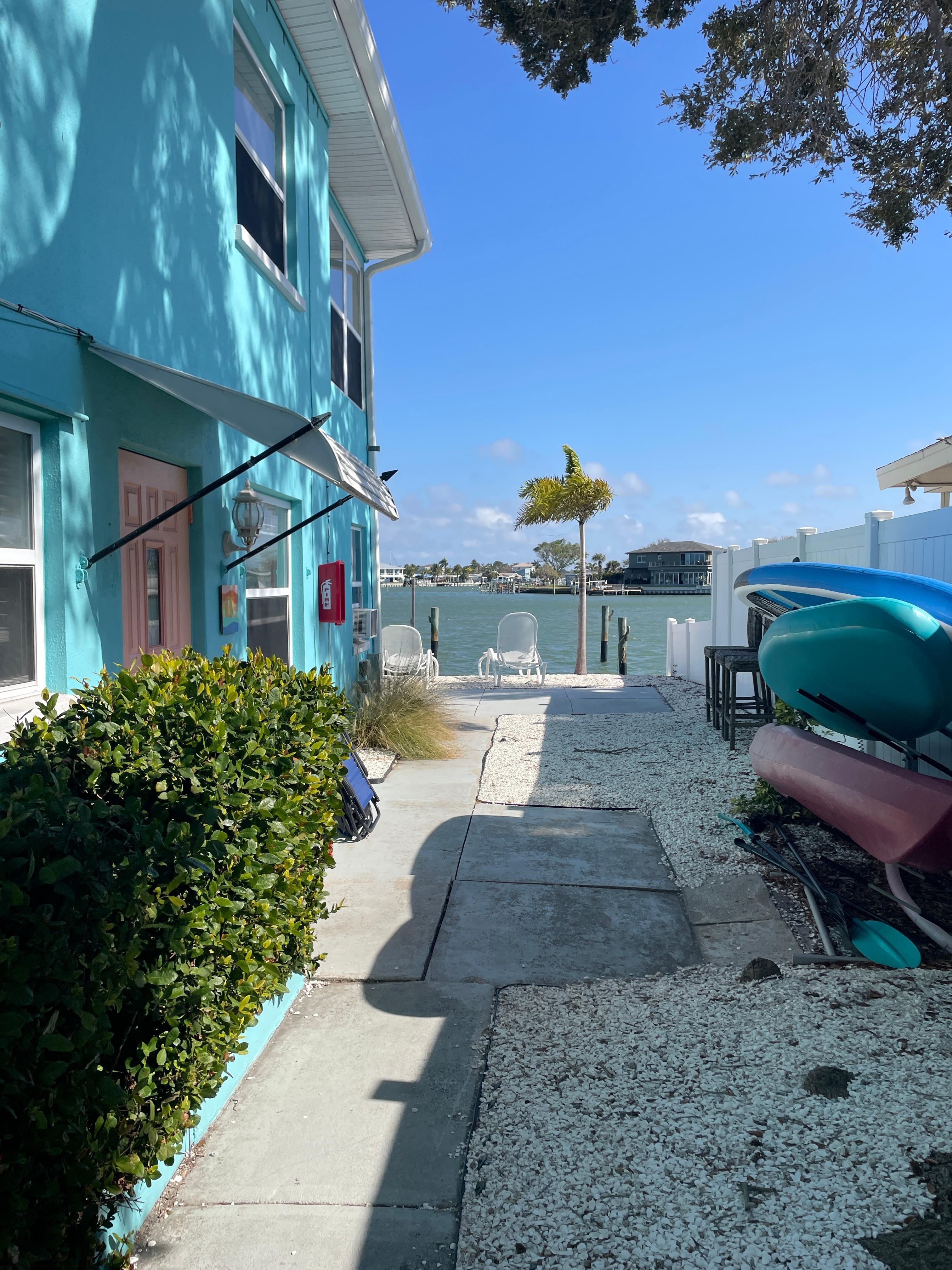 Book now and enjoy waterfront views! Watch dolphins from teh backyard! Relax and unwind at this newly renovated mid-century modern meets beachy-boho-chic 2 bedroom, 1 bathroom apartment directly on the intracoastal, 2 blocks from Indian Rocks Beach- a 3 minute walk! Gorgeous refinished terrazzo floors, freshly painted (inside and outside), beautiful furniture, and a family friendly neighborhood all makes for the perfect beach vacation. Bring your boat tie up to the dock.
