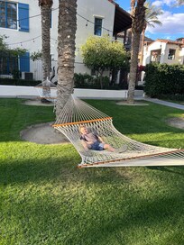 Woof! This unit welcomes up to two (2) dogs per booking. There is an easy walking trail next to the Santa Rosa foothills, which goes around the perimeter of the community (but keep an eye out for rattlesnakes). Downtown La Quinta boasts pet-friendly coffee shops and cafes. There is also doggie daycare and doggie wash services in town. Please note, however, that the HOA does not allow pets inside the gates of the pool areas. Max weight of 30 pounds per pet.