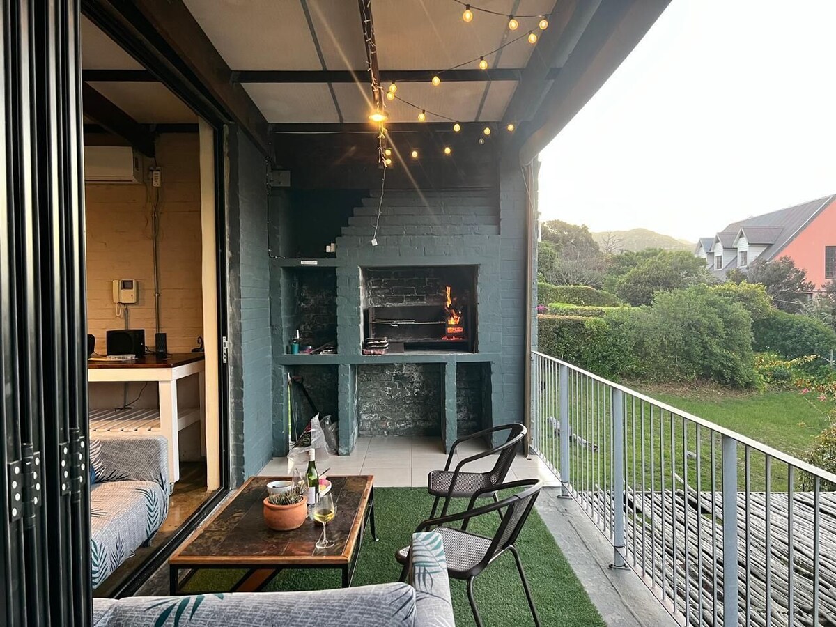 Your apartment is part of a larger home thoughtfully divided into three private units, each with its own entrance. Inside, the open-plan living area includes a cozy lounge, dining island, and a well-equipped kitchen. Glass stacking doors lead out to a private balcony with built-in braai and outdoor dining space: ideal for easy dinners, morning coffee, or sundowners after a beach day.