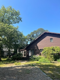 Salt Box style Log Home with open floor plan built by my family with a country feel, located on a wooded lot in the down island town of Oak Bluffs. Central Air and easy walk to local beach that is used by families of the Lagoon Heights area. Beautiful town and state beaches close by. Charter fishing, golf, great restaurants and ample shopping for the occasional rainy day. Many local attractions to visit, gingerbread homes, tabernacle, oldest functioning carrousel, walking/ bike trails and nature preserves to keep one busy while enjoying the the Vineyard's laid back, casual nature. First floor bedroom has queen bed, upstairs has the full bed. Loft area has three twin beds. Screened porch has wicker furniture, two couches and two comfortable chairs. The home provides a comfortable retreat for those that prefer to be away from crowds, yet only a short trip to town and the beaches.