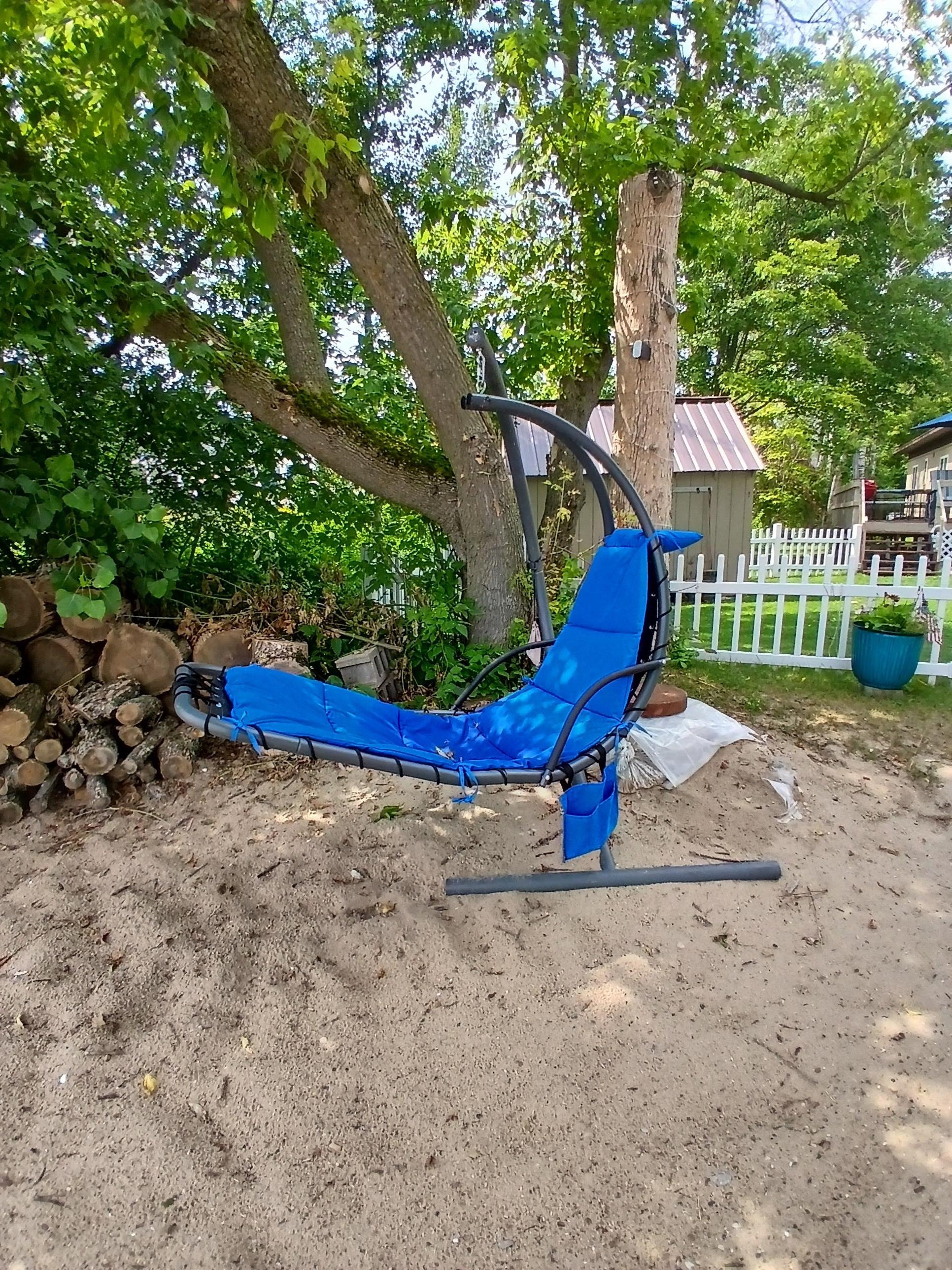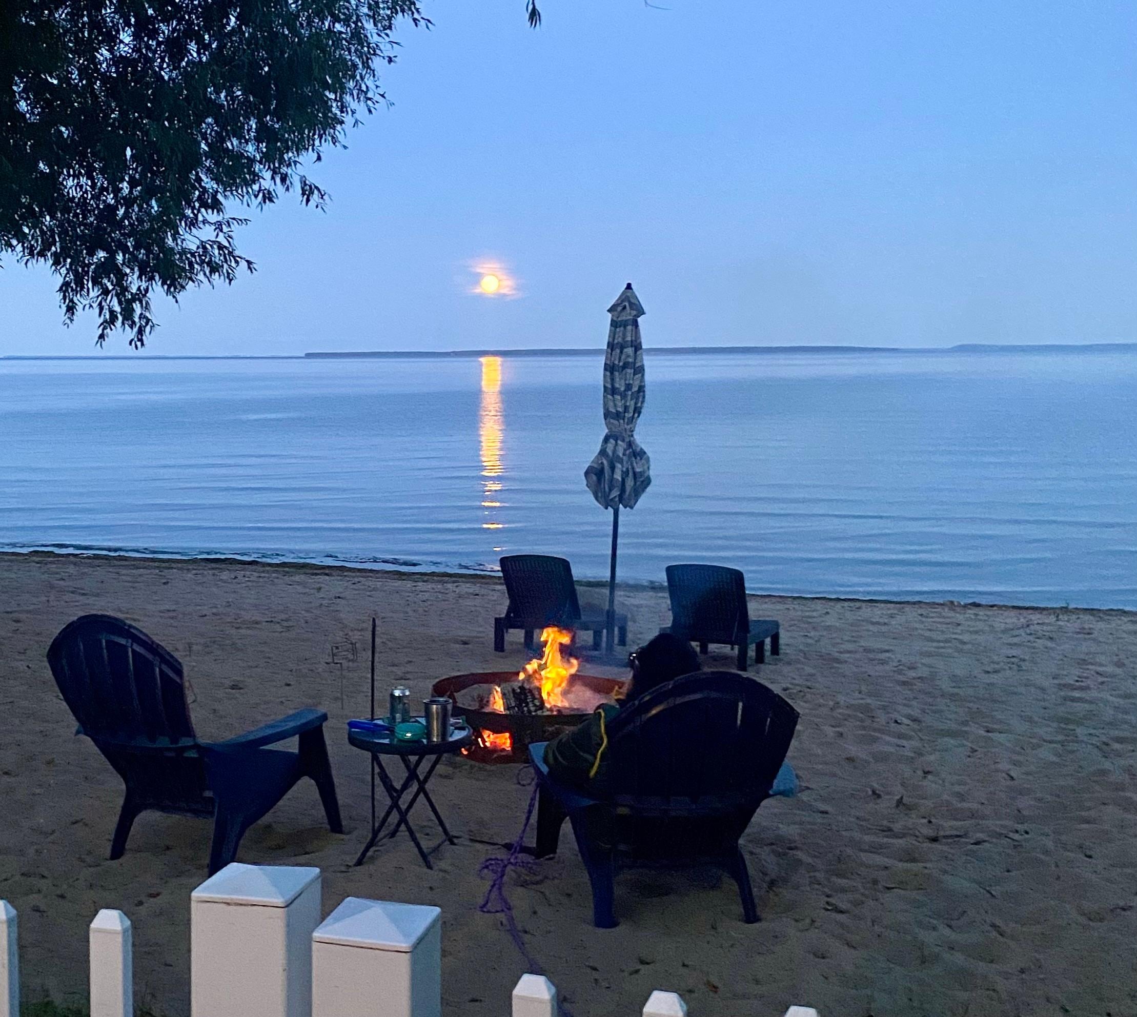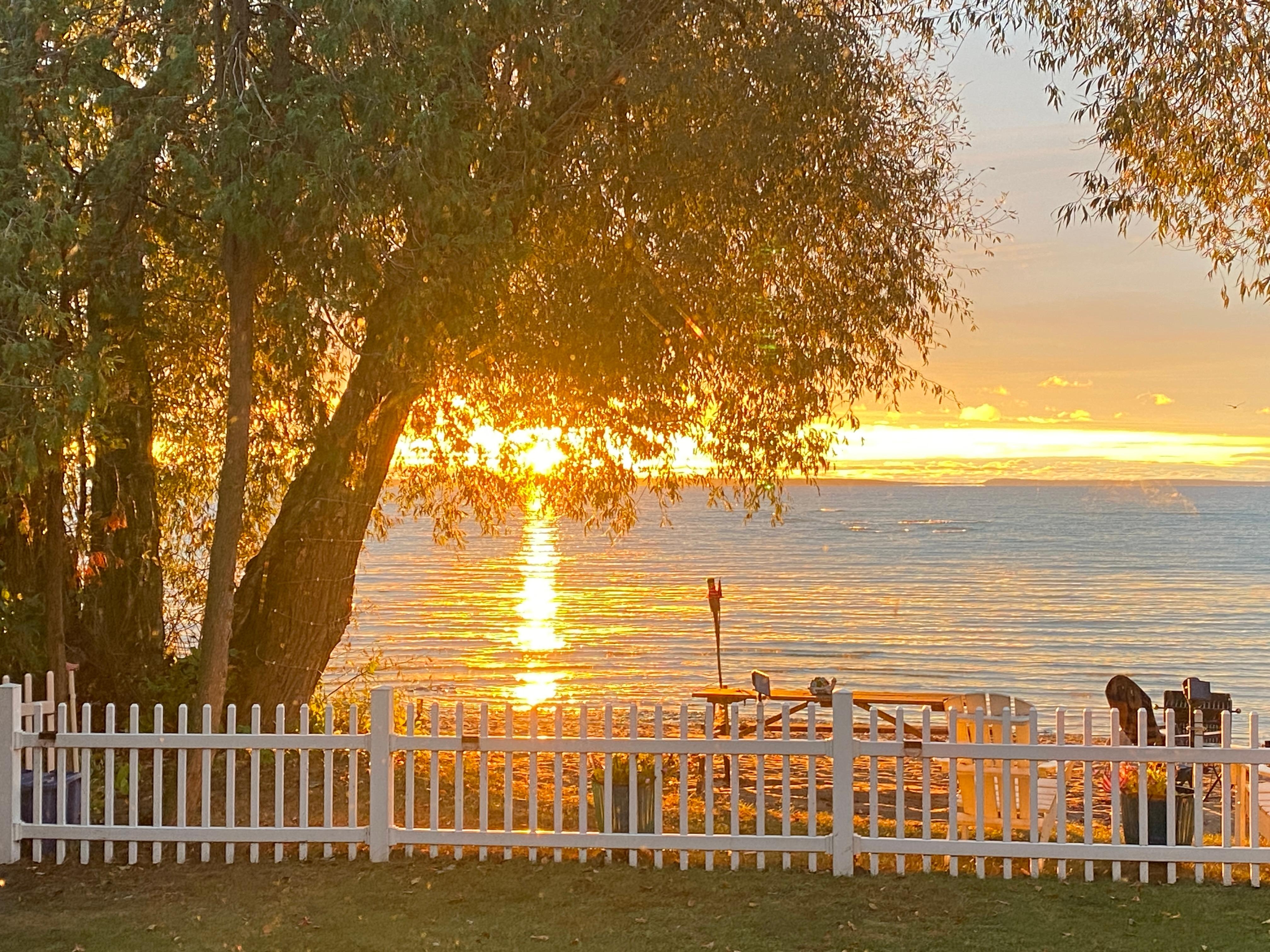 Imagine a beautiful sunrise/sunset on a private beach with a fire pit, gorgeous colored lights around the property, a hanging lounge chaise, ten more chairs, a picnic table, a paddle boat, and kayaks. The large deck has a charcoal grill and a park grill on the beach, plus rocking chairs, a lighted sun umbrella, seating for six, a three-person swing set, and a fence in the yard for your kids and dogs. The property has been completely updated and features a washer and dryer, a TV with local channels, a Samsung TV, and plenty of additional TV apps to which you can sign in. Additionally, an outdoor, waterproof, portable blue speaker provides high-speed internet, Wi-Fi, a cell booster, a cell charger compatible with all phone types, and air conditioning in each room. The fully equipped kitchen is for cooking. There is a shed full of games, sand, water, fun toys, and life jackets for humans and dogs. There are no extra fees for cleaning, coffee, paddle boats, kayaks, beach towels, or using a washer/dryer—great location to see Upper Michigan Destinations. Long-term guests (30 days or more) should email for a price quote. A 1.5-hour drive to Door County from the cabin, and we offer a much lower price per night with more privacy.