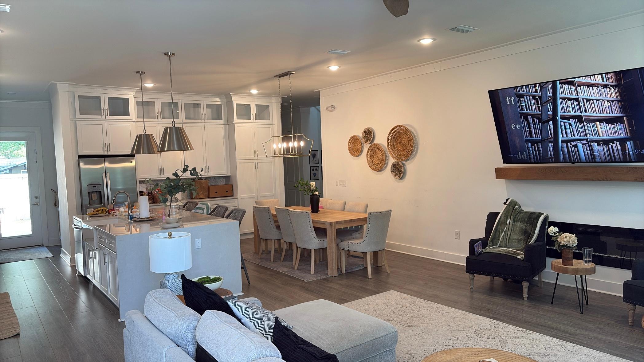 The gourmet kitchen showcases beautiful white quartz countertops, stainless steel appliances, a spacious island, and a designated dining room.