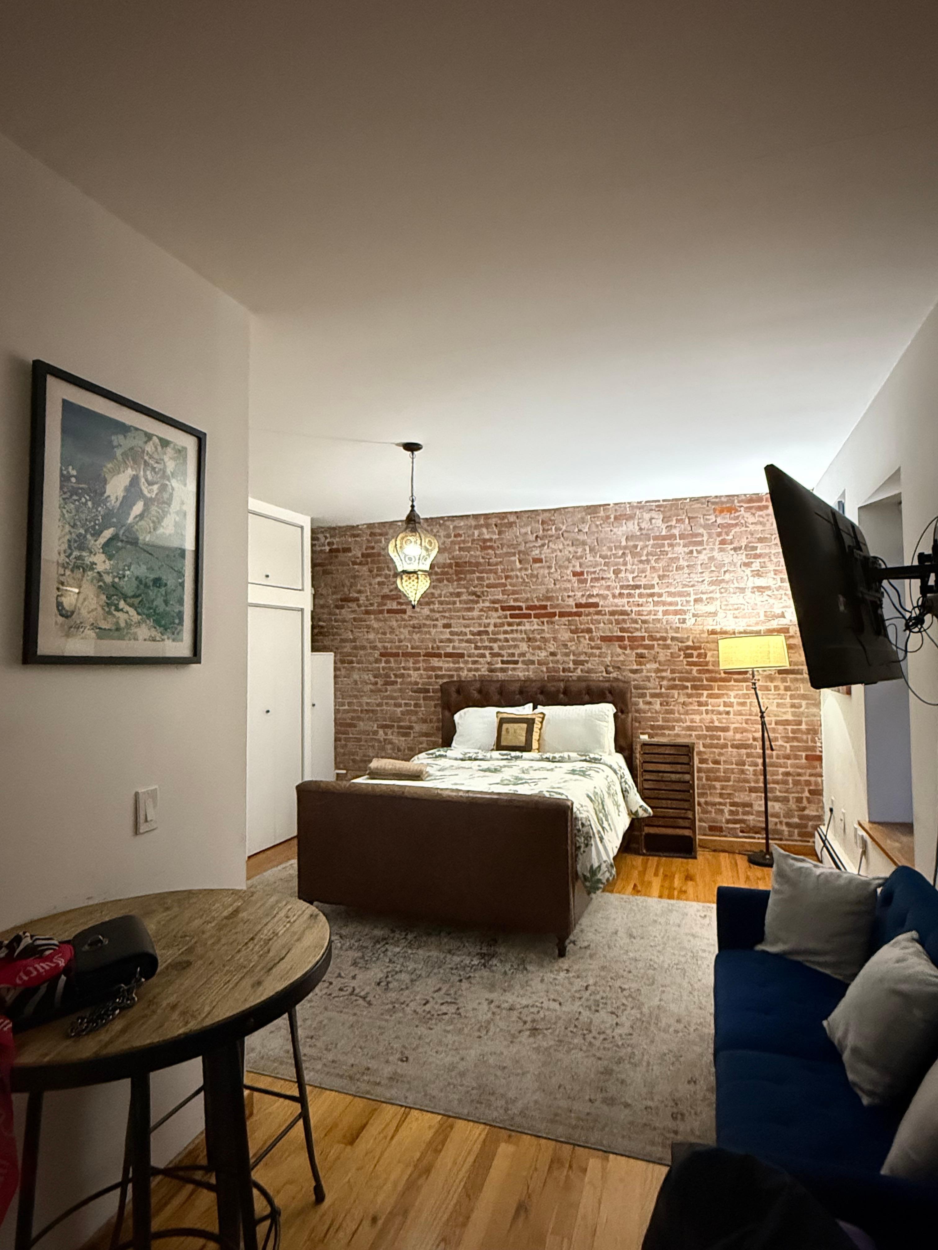 My home is a comfy and cozy cove of exposed brick, bright windows fresh white walls, hardwood floors, a recently updated bathroom, and an amazing cozy space.