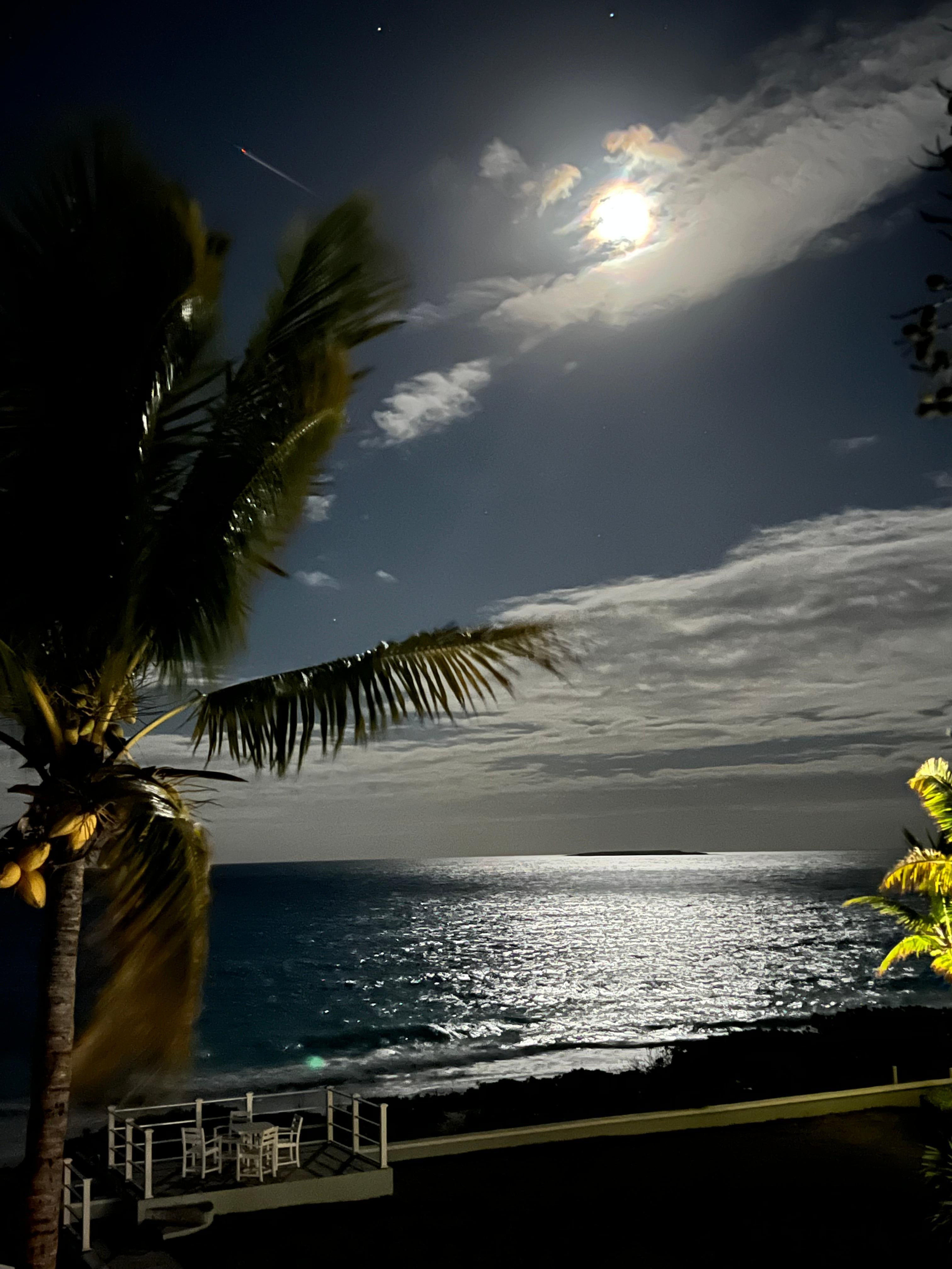 The upstairs double master bedroom has a large balcony that overlooks the sprawling grounds and spectacular ocean. It has a king-sized bed and a screened off separate area containing a full-size bed, perfect for a family. A wall mounted TV allows for viewing from any angle. Here, there is a bookcase with DVDs and books. The master bath has a walk-in shower that can easily accommodate 2 people, twin vessel sinks, and a water closet with a separate door to keep private matters very private.