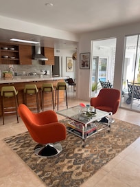 Stay comfortably in the heart of Palm Springs at this 4-bedroom midcentury marvel. The main house features 2 guest rooms with king size memory foam mattresses and 1 guest room with 2 XL memory foam twin beds; and a separate, roomy Casita with a full sized memory foam mattress, mini fridge and its own ensuite bath. Guests will have plenty of space to relax and enjoy all that the desert has to offer; including newly renovated kitchen, baths, and heated pool and jacuzzi, WiFi, central air and heat, large capacity washer/dryer, and a "street legal" electric golf cart for $100/stay. Each bathroom is fully equipped curated toiletries, hair dryers, Egyptian cotton towels and well-pressured showers. Enjoy your time in Palm Springs at our fantastic hideaway on the 17th hole.