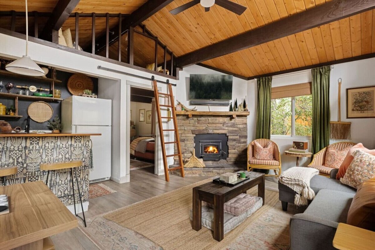 Step into a boho-vintage sanctuary with our fashionable Big Bear cabin, a trendy mountain hideaway just a stone`s throw from Southern California. Dive into a world where bohemian style meets vintage allure, set against the backdrop of stunning mountain vistas. Ideal for nature enthusiasts and those with a boho spirit looking for a chic mountain getaway, complete with hiking paths meandering through the woods. Additionally, relish the proximity to the village, just a 15-minute drive away.