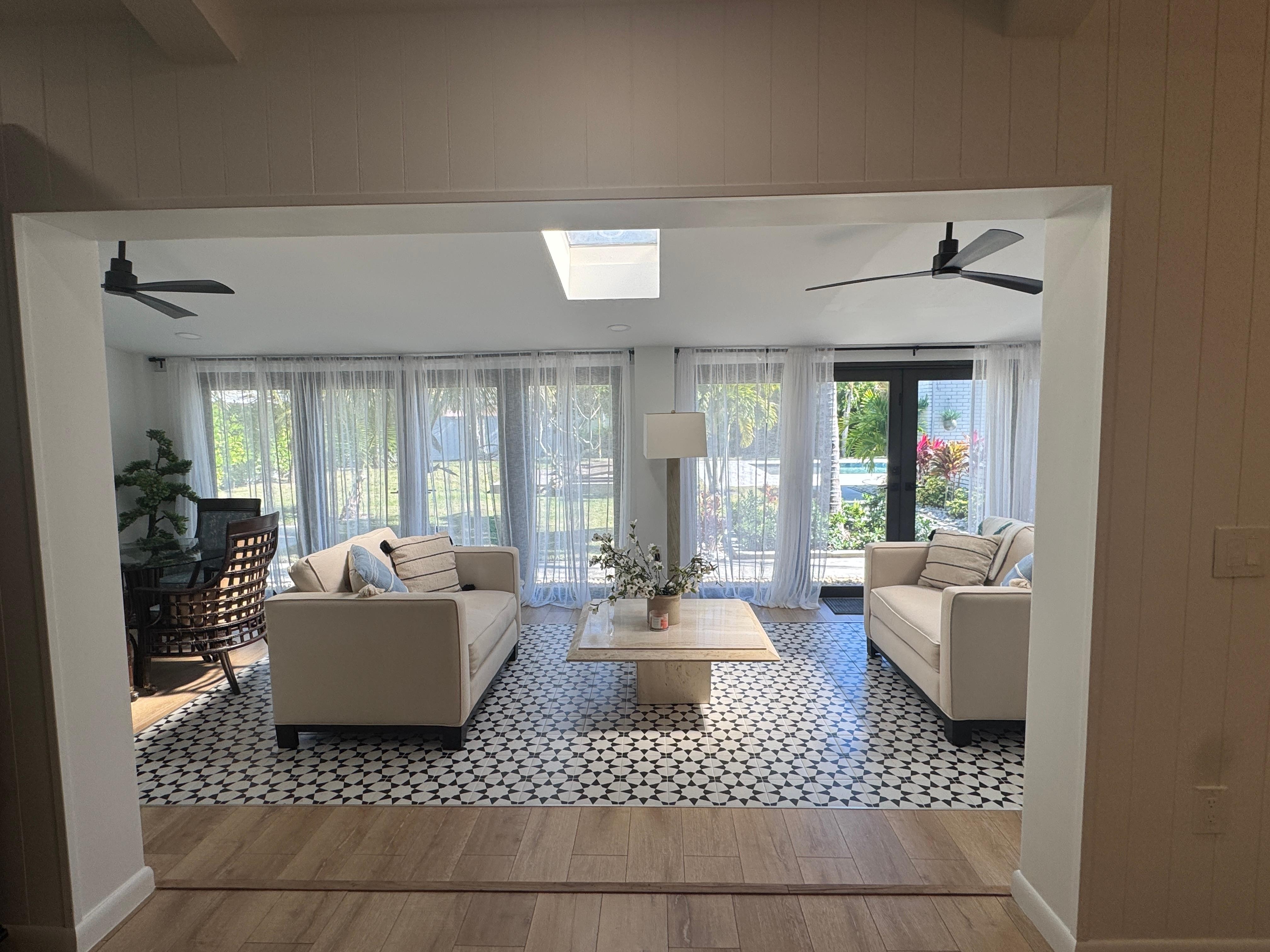 The property showcases a brand-new heated pool on an extra-large lot enclosed by a fully fenced and gorgeous tropical landscape for privacy. The expansive backyard is equipped with several varieties of resort-style chaise lounge chairs, creating an ideal setting for relaxation. During the evening you can hang out around the fire pit or go for a nighttime swim under the palms, enjoying the coastal breeze off the Gulf of Mexico.
