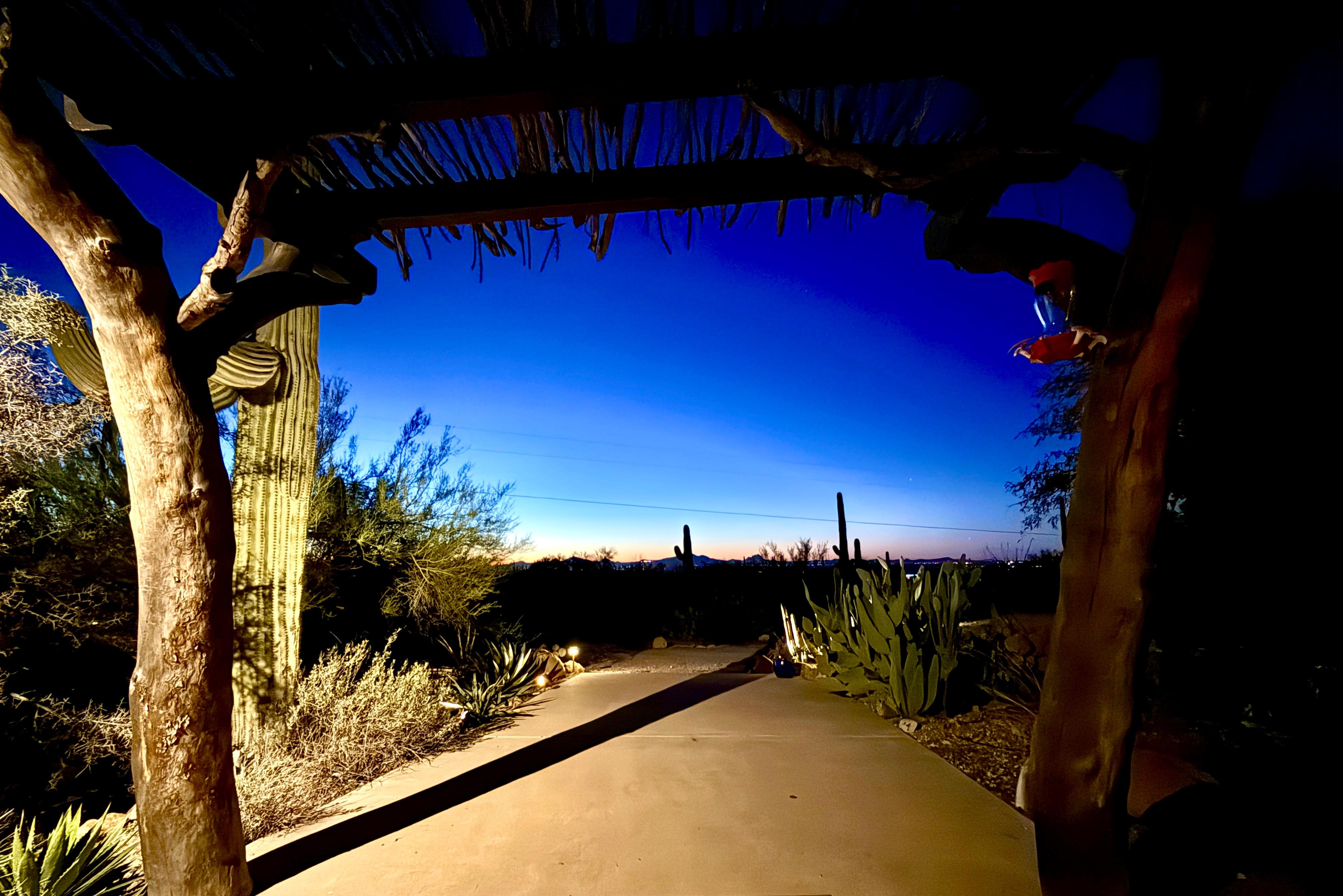 We’ve stayed in many vacation homes around the world and Artists Delight is among the very best. The house, kitchen, furnishings all look brand new, the desert landscaping is outstanding. The bed was very comfortable. We enjoyed the Smart TV in the evening, which was very easy to cast to from our Android phones. The house is filled with very interesting art. Equally important is the location in a true desert area, not a city lot. You look out the front or the back and its Saguaro cactus and desert plants as far as you can see. It’s about 15 minutes from the Desert Museum which is fantastic, the Park Visitor Center, trails and Signal Hill petroglyphs. Fry’s is an excellent supermarket, also about 15 minutes away. We spent 7 days exploring the Tucson area and had a great time. In addition to the Desert Museum, the Air and Space Museum, the Biosphere2 and a trip up Mount Lemmon are all well worth doing. Danielle was very quick to respond to our questions and provided directions to the nearest Petroglyphs. When our travels bring us back to Tucson, we’ll definitely stay at Artists Delight.