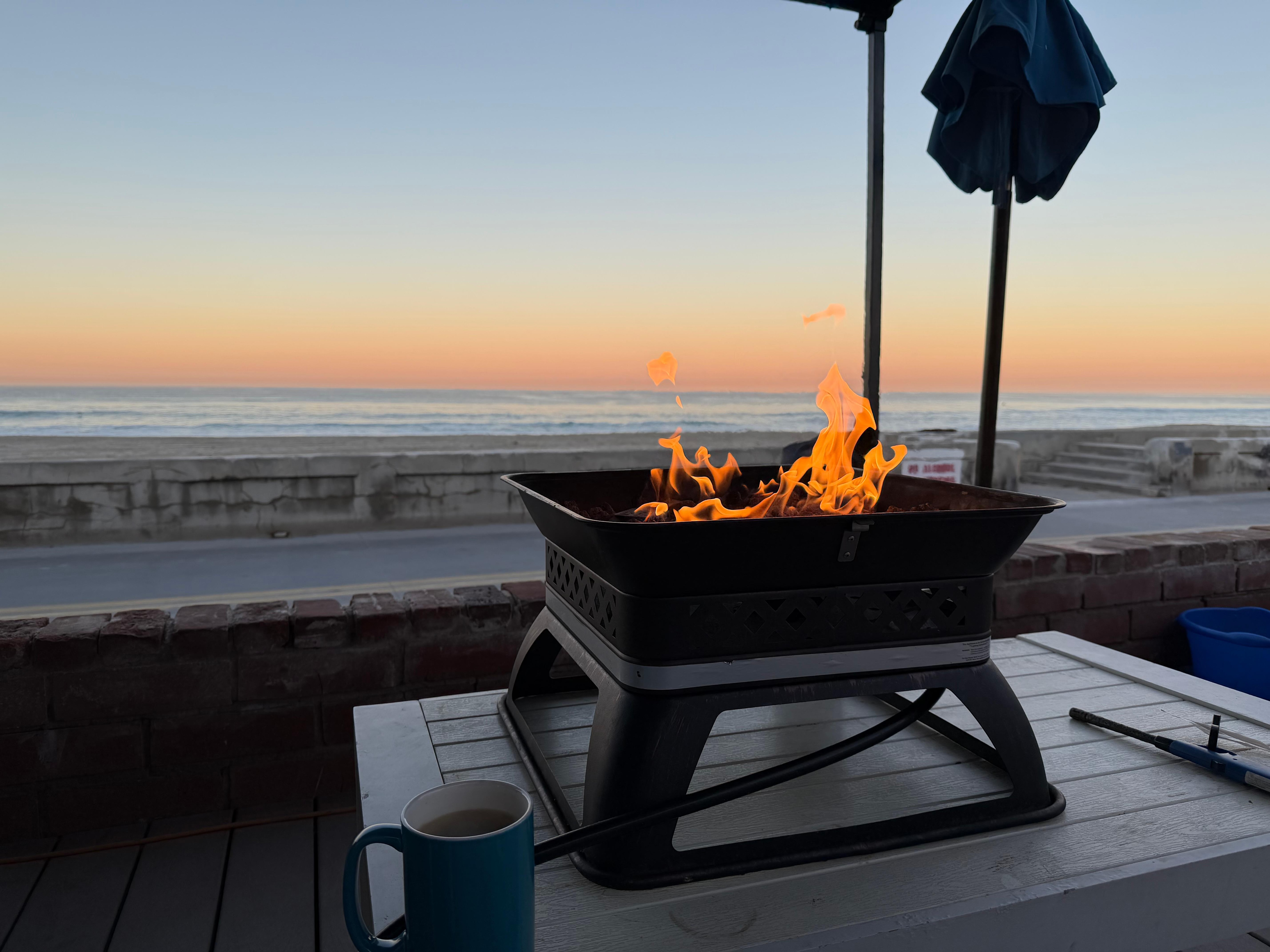 We have two 10x10 pop-ups deployed in front of the house. One has a picnic table with party lights. The other has 2 sofas and a coffee table. It is possible to just "sit" and watch the ocean for many hours and not get sun-burned. Also, during winter months, the pop-ups shelter against "heavy fog" coming off the water ... We have electrical outlets on the patio to power your gadgets.