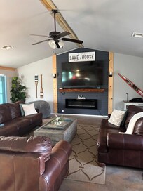 Escape to your lakeside dream home on Okmulgee Lake! This charming 2-bedroom retreat comfortably sleeps up to 8 guests with a king, queen, sofa sleeper and bunk beds. Unwind in the cozy living room by the fireplace or catch up on work in the dedicated workspace. Entertainment abounds with an 85-inch TV, soundbar, electronic dartboard, and a variety of games. Outside, discover a serene wooded property featuring a lit patio, fire pit with Adirondack chairs, and a gas grill—perfect for evenings under the stars. Follow the trail to your private 10x30 covered boat dock with a 10x12 swim platform, your gateway to Okmulgee Lake's excellent fishing, hiking, and water recreation. Create unforgettable memories in this idyllic outdoor paradise!