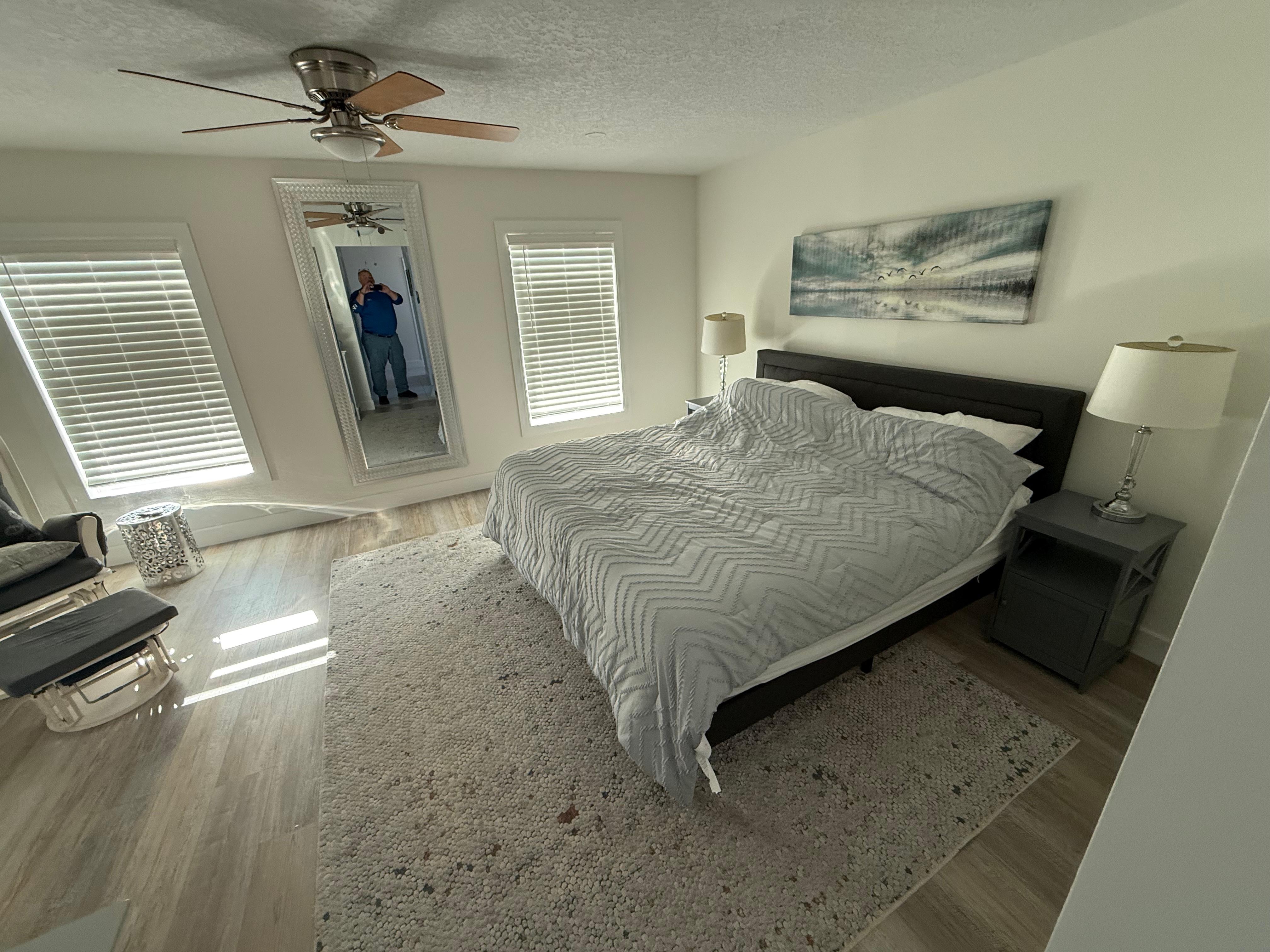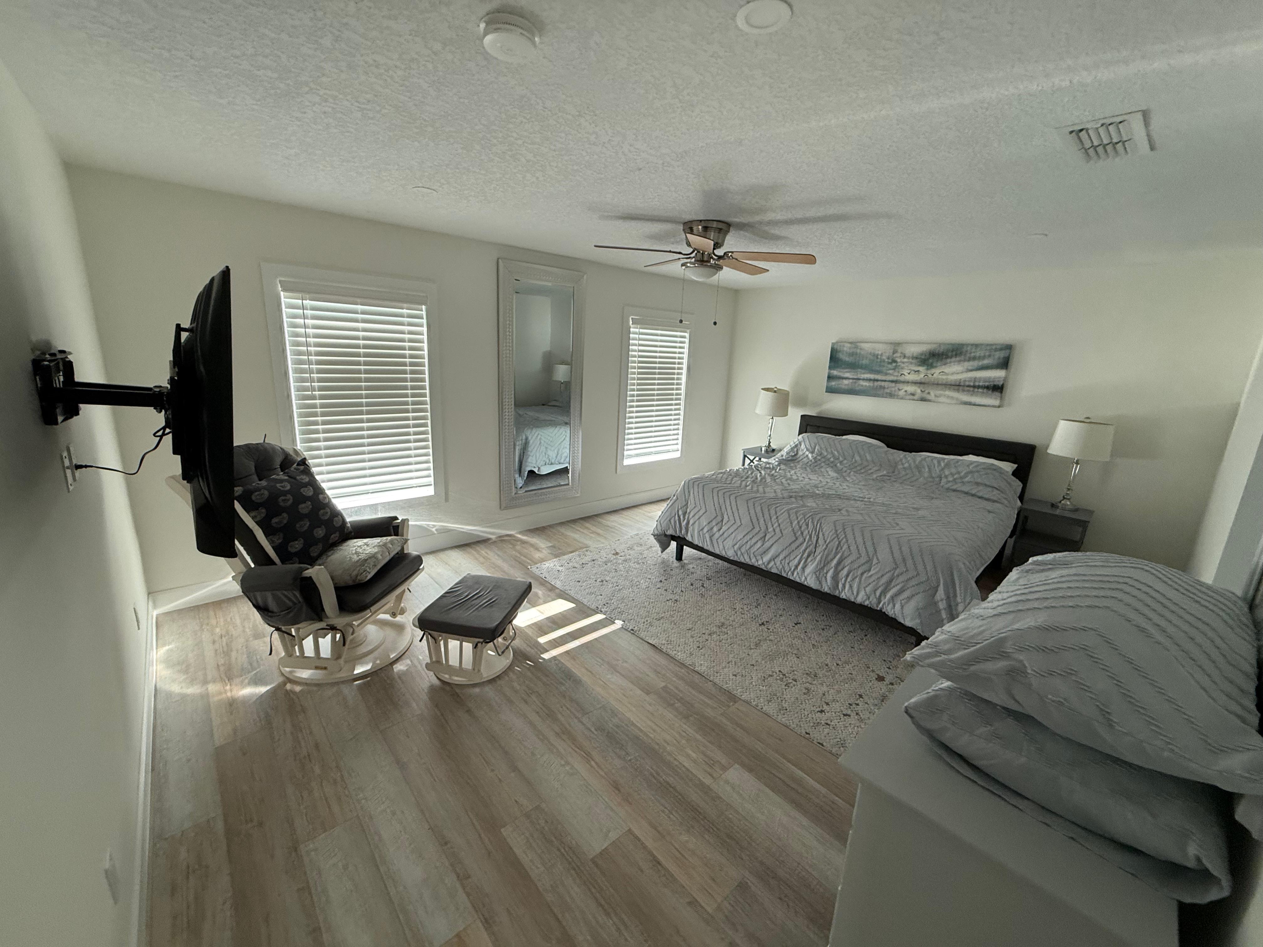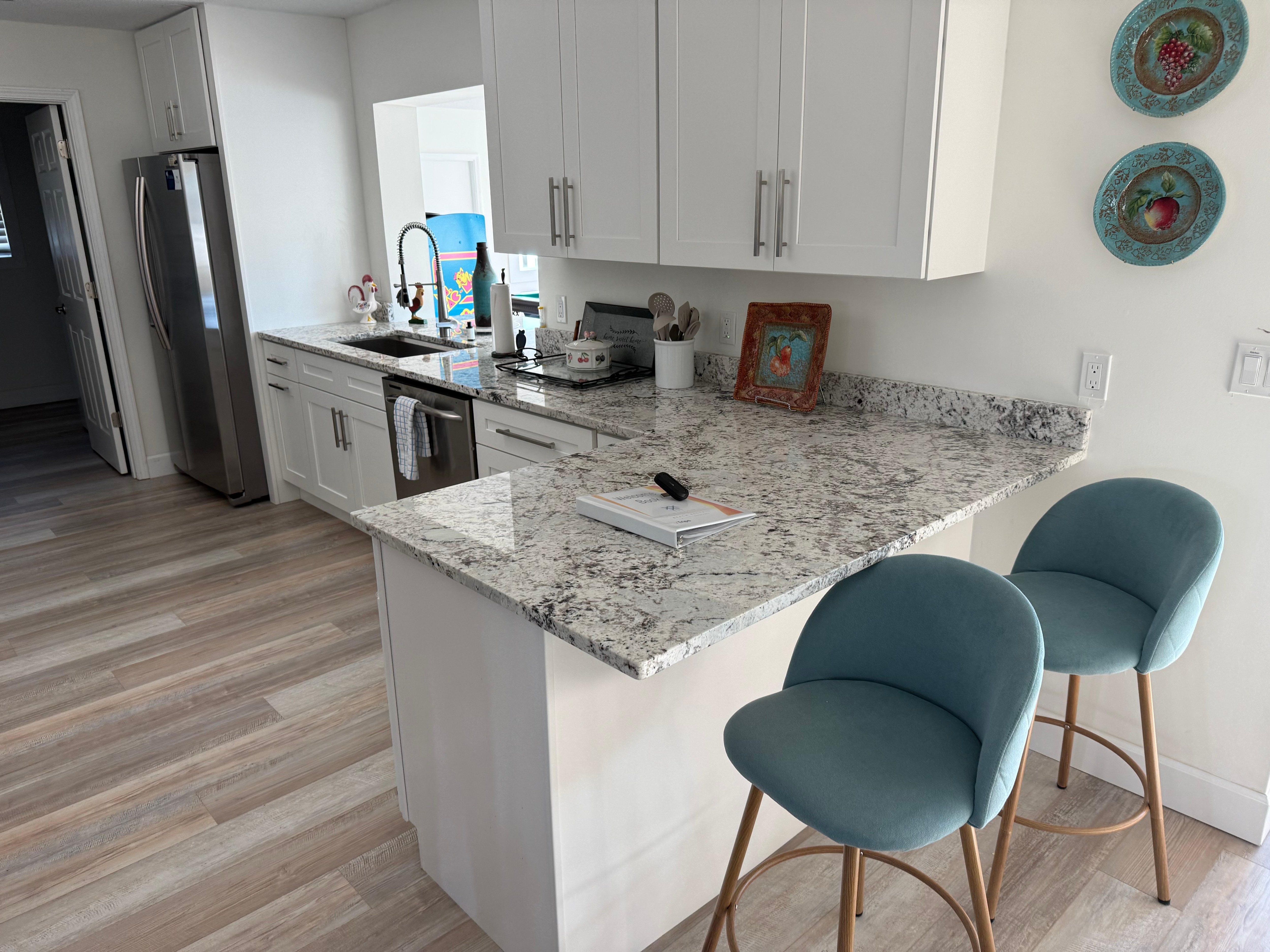 Step inside to discover an open-concept layout with sleek granite countertops and contemporary finishes. The spacious living area includes a plush sofa and large Smart TV, while expansive windows bring in the serene backdrop of the saltwater canal. Whether you're sipping morning coffee or enjoying a family movie night, the roomy living space makes it easy to unwind.