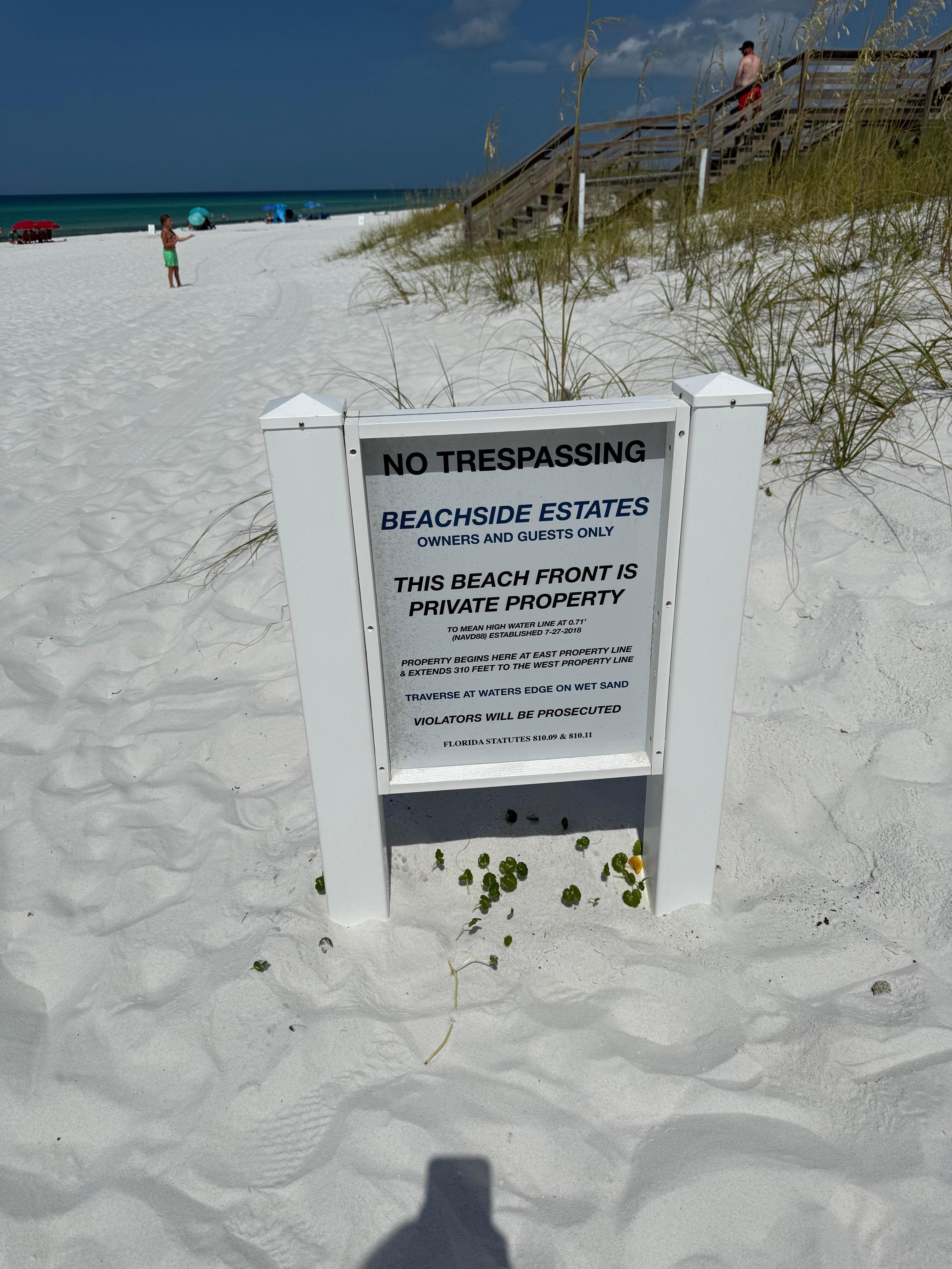 One at the end of San Roy Rd and the other at Walton Dunes Access. Beach service is available at Walton Dunes Access. We do not recommend using the beach access by building 6 due to the security guard posted by Sugar Dunes and the private homes. Guests should be made aware that this access is intended solely for reaching the Gulf. To set up on the beach, they will need to walk west past the private homes or east past Sugar Dunes.