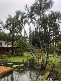 The house was designed with flexibility in mind. The main wing of the house offers three bedrooms, three full bathrooms, huge living/dining room, and a gourmet kitchen. There are plenty of windows giving the rooms a warm glow of light. The peaked roof is supported by two huge cedar pillars. Other features include wood floors, tiled kitchen and custom tiled bathrooms, granite and butcher block counters, Viking range, laundry, TV, DVD and CD stereo. The front of the main living room opens to a covered deck, leading down to a platform at the edge of the fish pond.