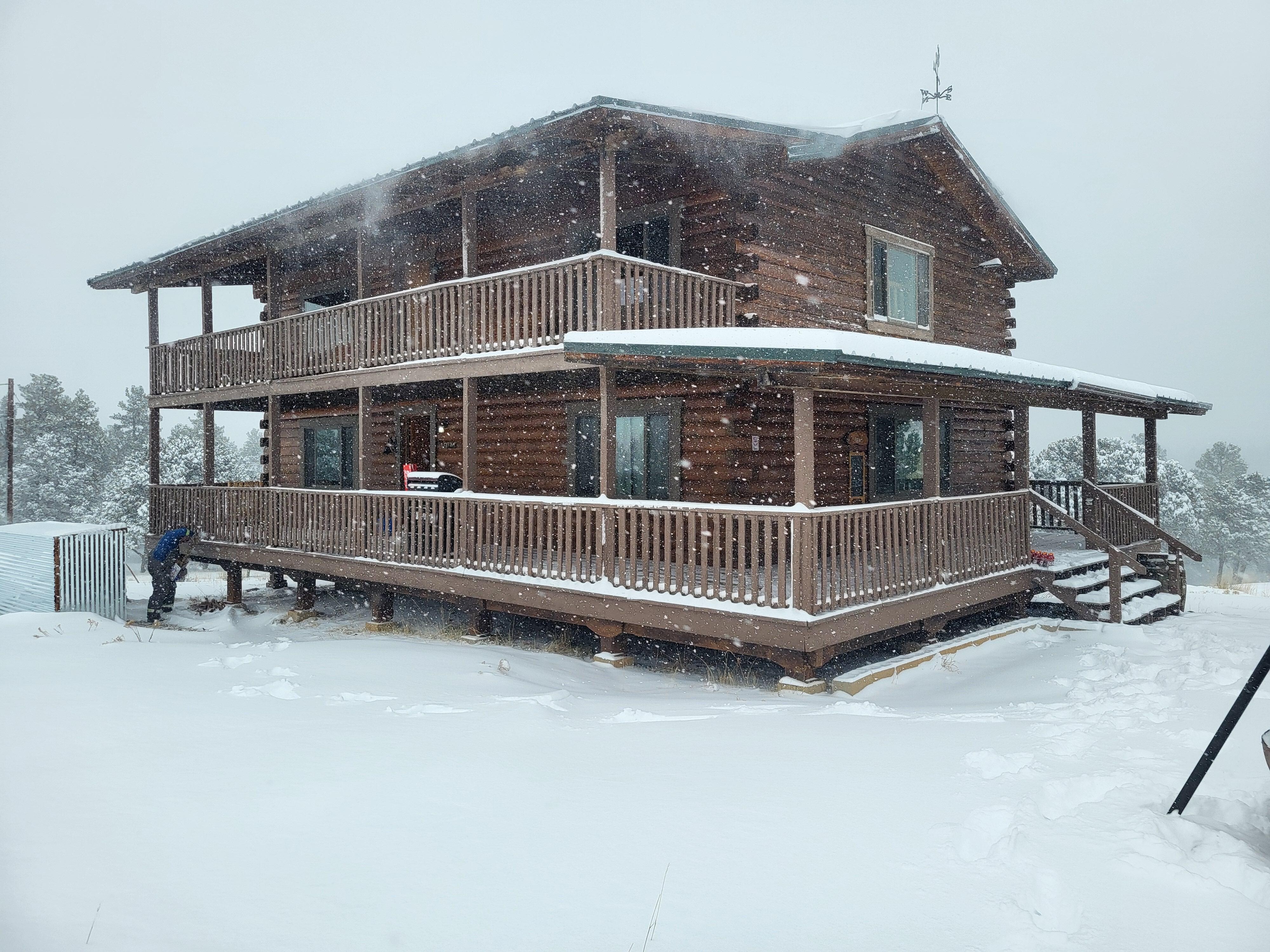 Relax with the whole family at this peaceful place to stay. Open log cabin with fireplace sleeping 9 on 35 acres with spectacular views of the Spanish Peaks and Sangre de Cristo mountain range. Situated in a beautiful meadow with a backdrop of pine trees. Has fun game room with bar, foosball, ping-pong & pool tables. 9-hole disc golf course. Cozy, comfortable ... Colorado!