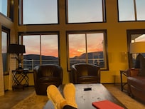 Upon entering, you’re greeted by a wall of large windows framing the dramatic scenery. Natural light floods the gorgeously designed living area. The open-concept kitchen and dining space allow you to cook, dine, and connect with your group, while the bar and living area provide the perfect spot to share a drink and laughter.