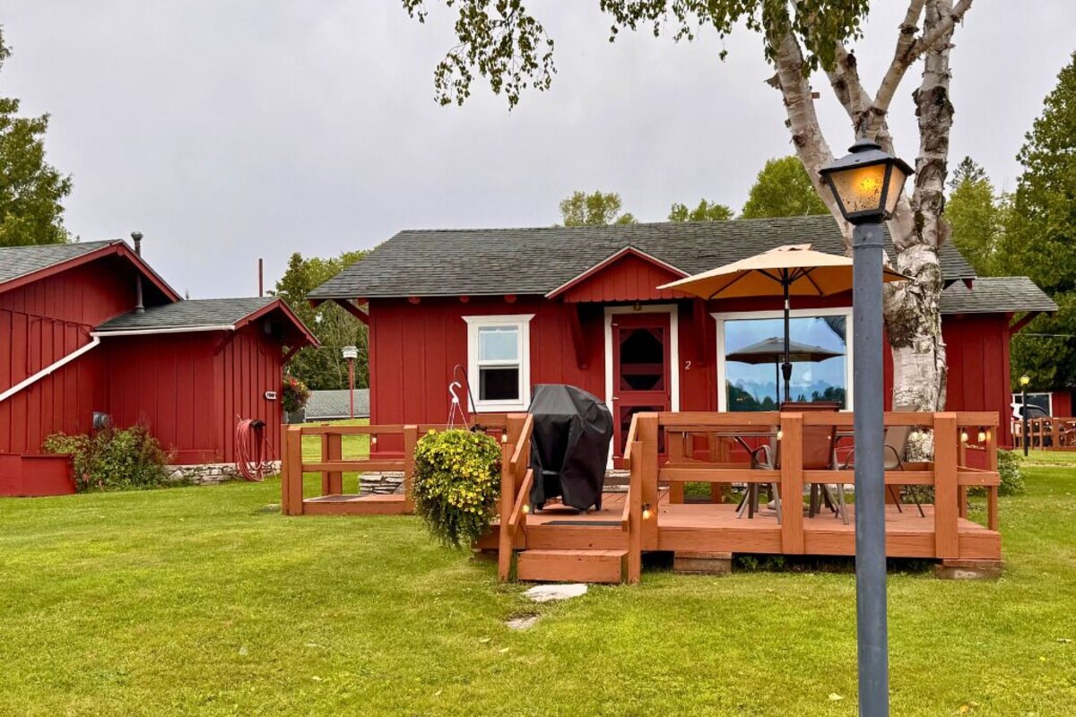 Charming 2-bedroom cabin is located steps away from Frenchman Lake in the tiny village of Trout Lake, MI. This unit sleeps 4 people, max. 2 Bedrooms each with 1 full size bed and a cozy living room with a Day Bed twin sleeper. Guests will have a wonderful time relaxing after a day of fishing or exploring. This unit features rustic wood finishes throughout. The bathroom has a stand up shower, bath towels and hand soap included. Wall mounted flat screen television with Direct TV. Full kitchen includes small stove, microwave and full size drip Coffee maker (filters included) and a toaster. Pots and pans, plenty of cooking utensils and dinnerware. Sponge, dish soap and dish cloths included. Dining table with seating for 4. All bed linens, bathroom and kitchen towels are included - replenished as needed and upon request. Extended deck area has an outdoor table, umbrella and chairs. Well maintained Weber Gas grill with cooking utensils is located on your private deck for convenience. Free WiFi available throughout the resort. There's a small dock directly in front of this cabin that extends into the lake and includes the use of 1 row boat with an upgrade option for trolling or gas motor as a daily or weekly rental. Also available to rent are kayaks and pontoon boat. Or explore the lake on our small paddle boat from the long dock. We do supply life jackets and boat cushions. We are a small, family owned resort close to hiking and side by side trails. We offer nightly campfires (weather permitting) located on the patio by the waters' edge. Keep an ear out for our local common loons and a watchful eye for the majestic eagle family that nests near the lake. This area is home to many wildlife, if you're lucky enough to spot them. We are centrally located to many area attractions including Tahquamenon Falls, Mackinac Island, Whitefish Point and the Lighthouse Shipwreck Museum, The Soo Locks and many others.