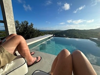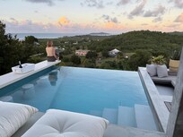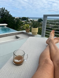 The cottage offers breathtaking ocean views and features a private saline infinity pool that seamlessly flows into a spa tub—ideal for soaking under the stars. Take a refreshing rinse in the outdoor shower, relax on the sun deck with double chaise lounge, or enjoy the sunk-in booth area.