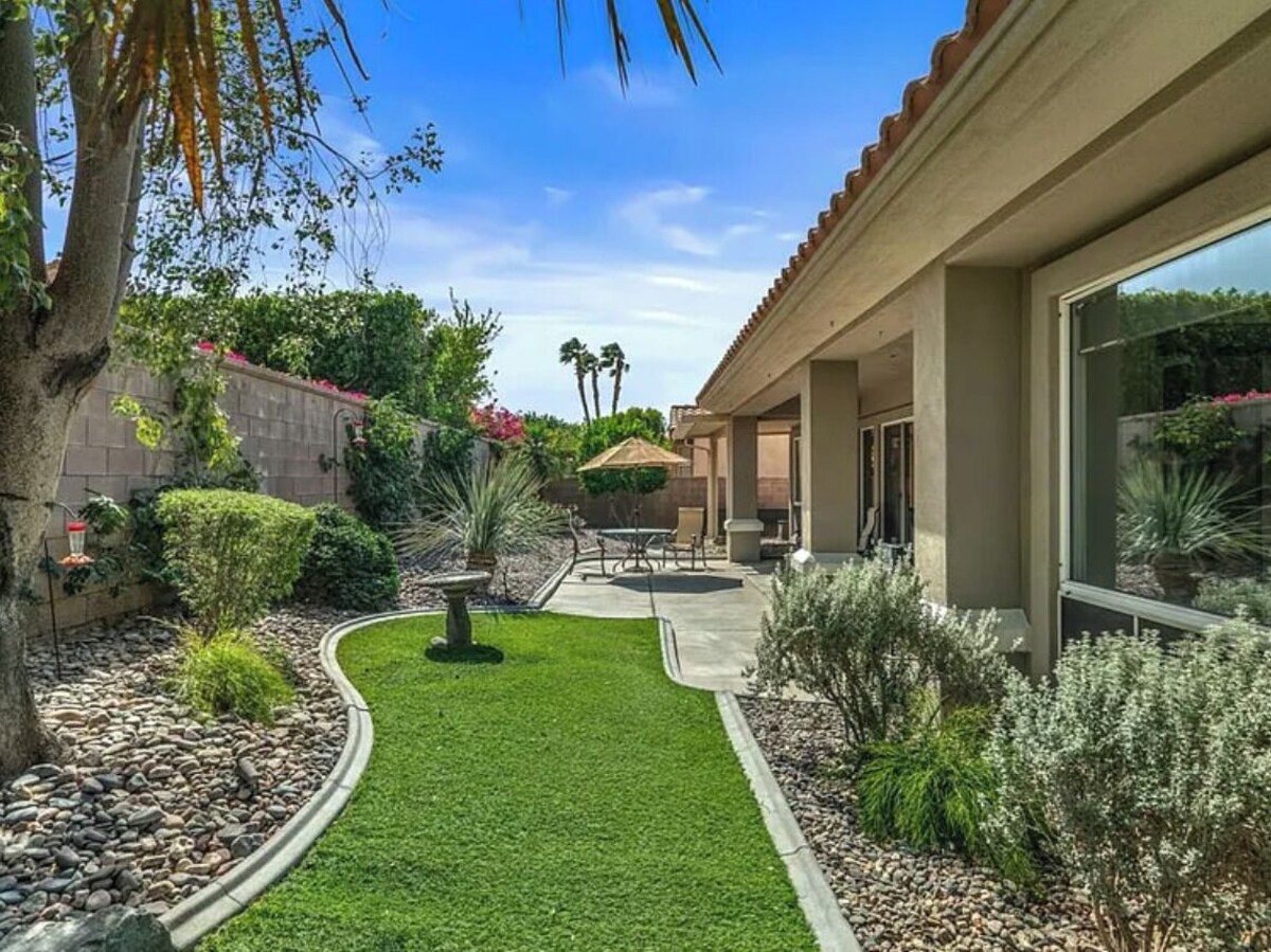 Palm Desert is waiting for you at this 4-bedroom house. Step into this delightful retreat featuring 2 king beds, 1 queen bed, and 1 sofa bed. Enjoy the tranquil ambiance and unwind in the bathtub after a day of exploring. With AC, heating, and a community fitness room, pools, tennis and golf, guests can relax in cool comfort. We think our place will help you experience everything Palm Desert has to offer.