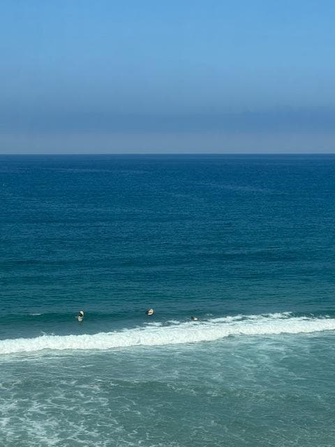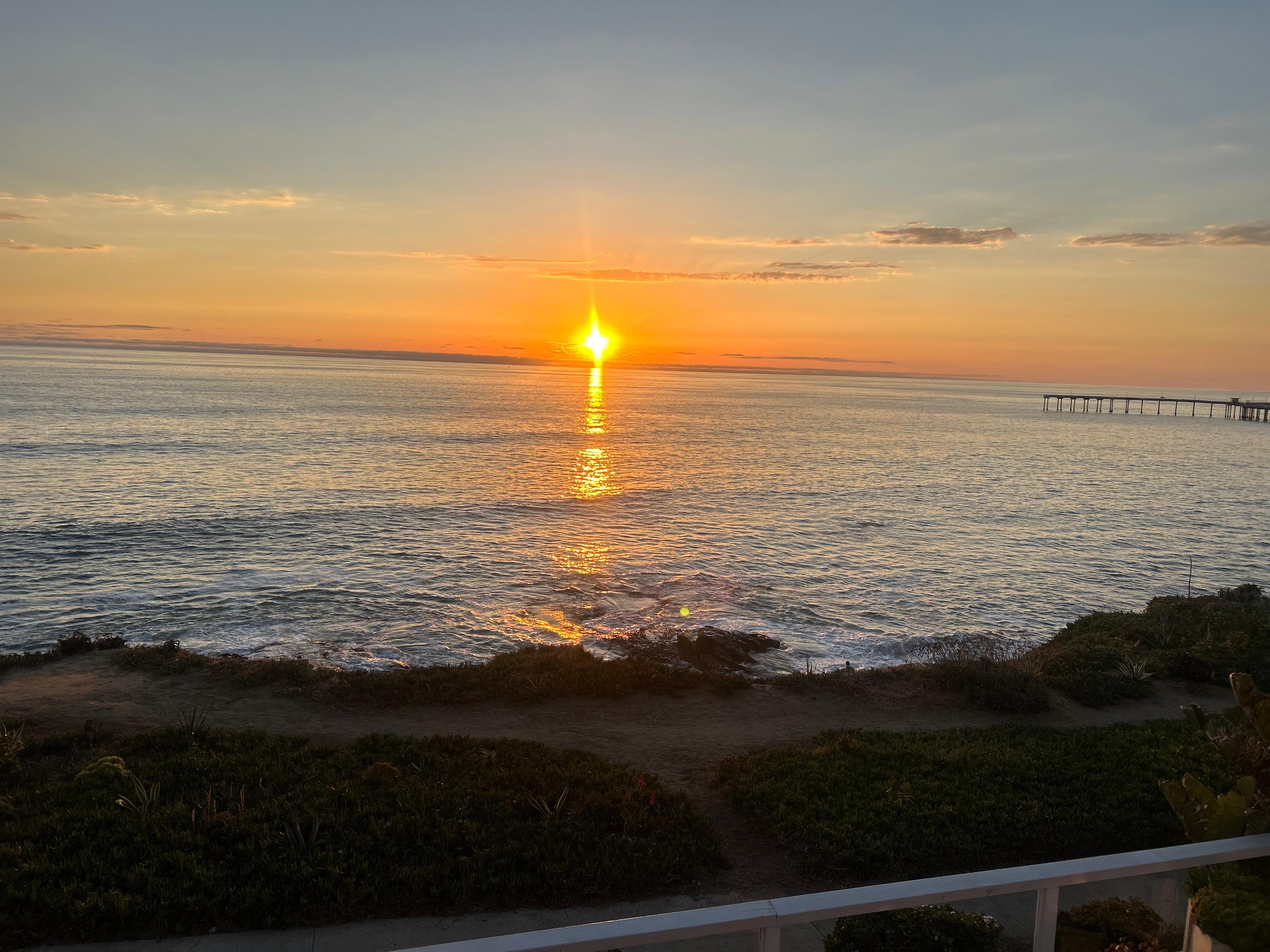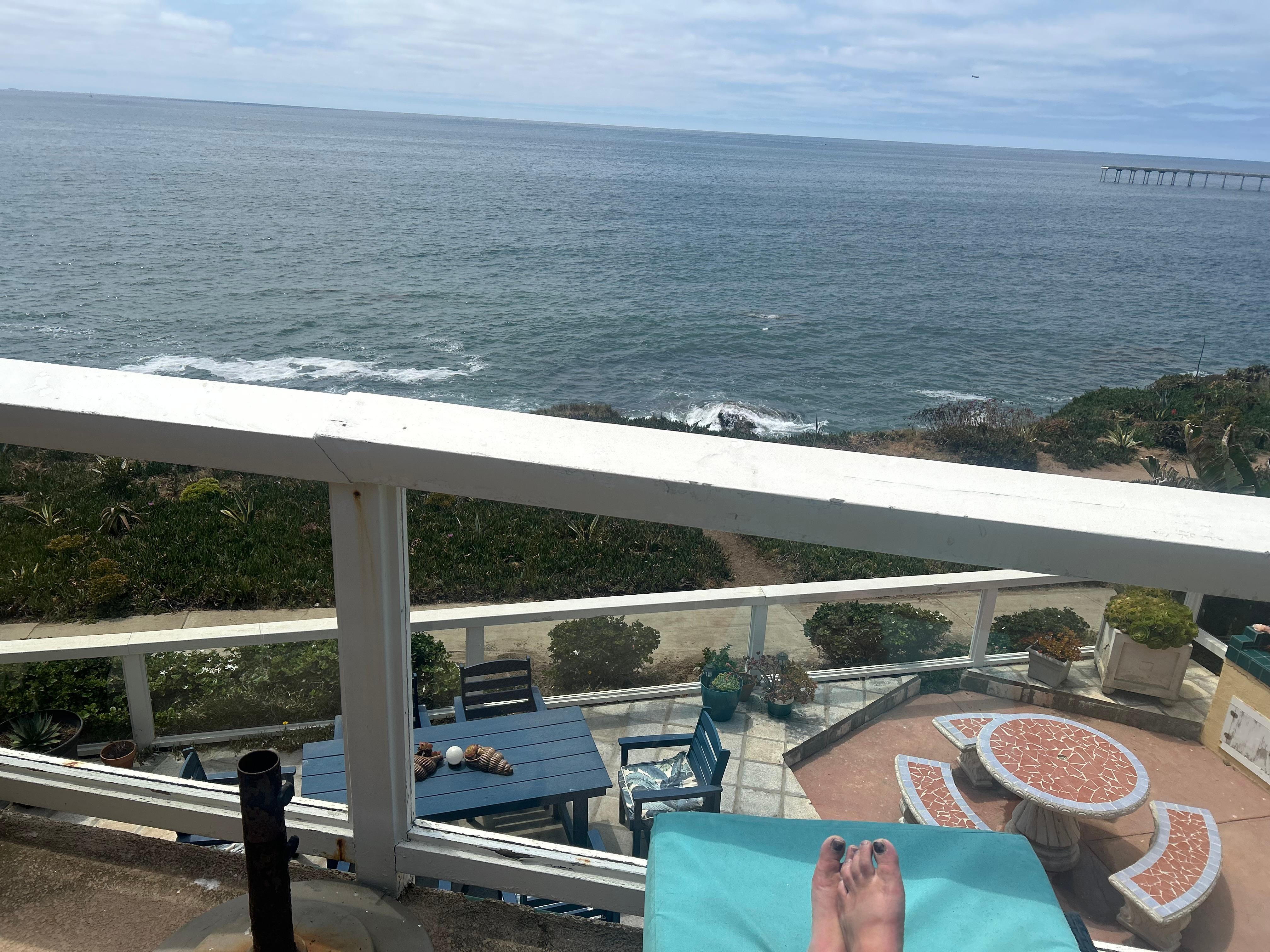 It is just a short walk down sturdy steps to explore the tide pools below or to go to a pristine white sand beach in a secluded cove. If you prefer to play in the surf at a large public beach with lifeguards, it's only a seven-minute walk. Fishing on the Ocean Beach Pier and surfers add interest to your view (and your photos)! At night, the lights of La Jolla sparkle in the distance.