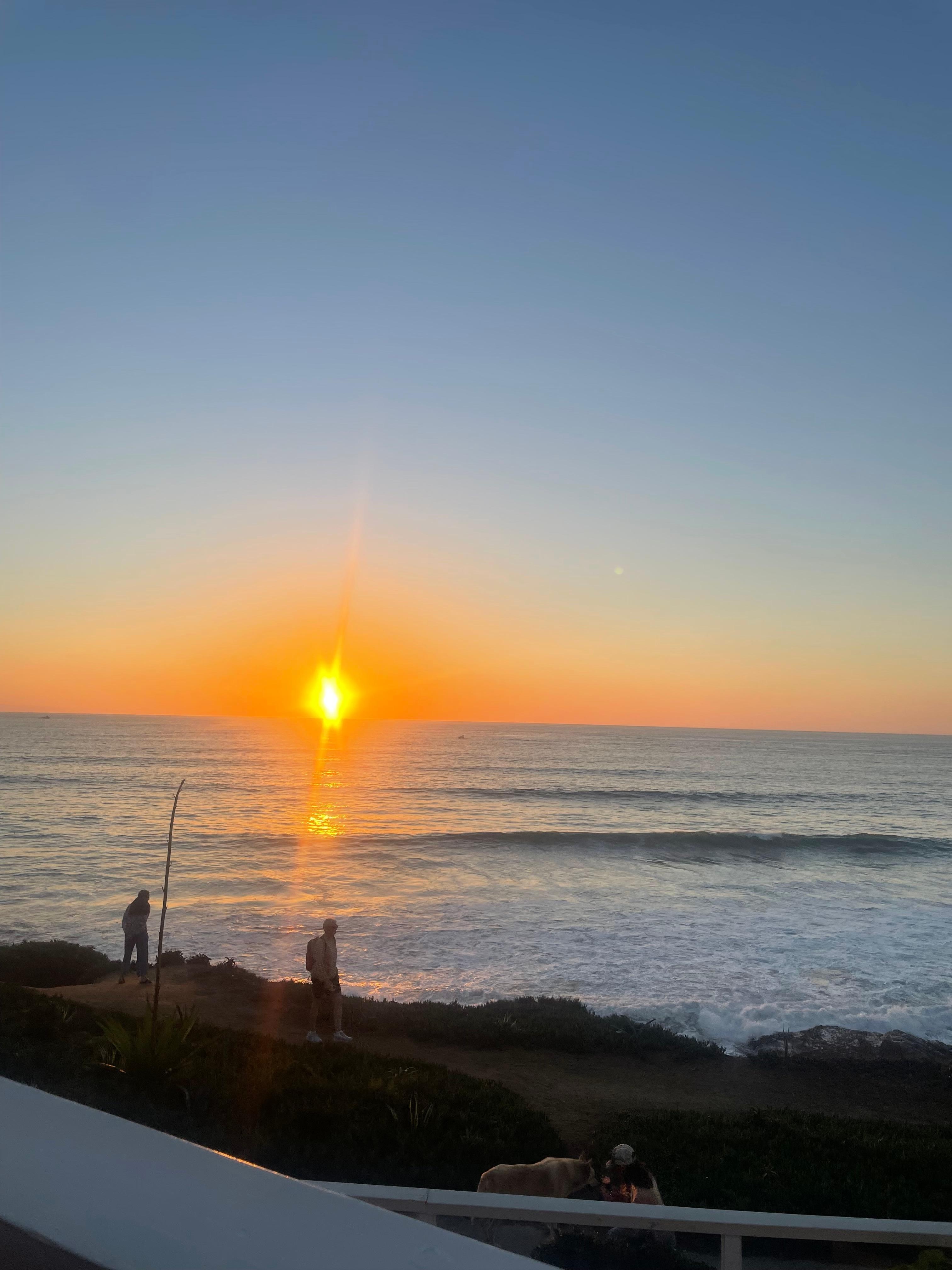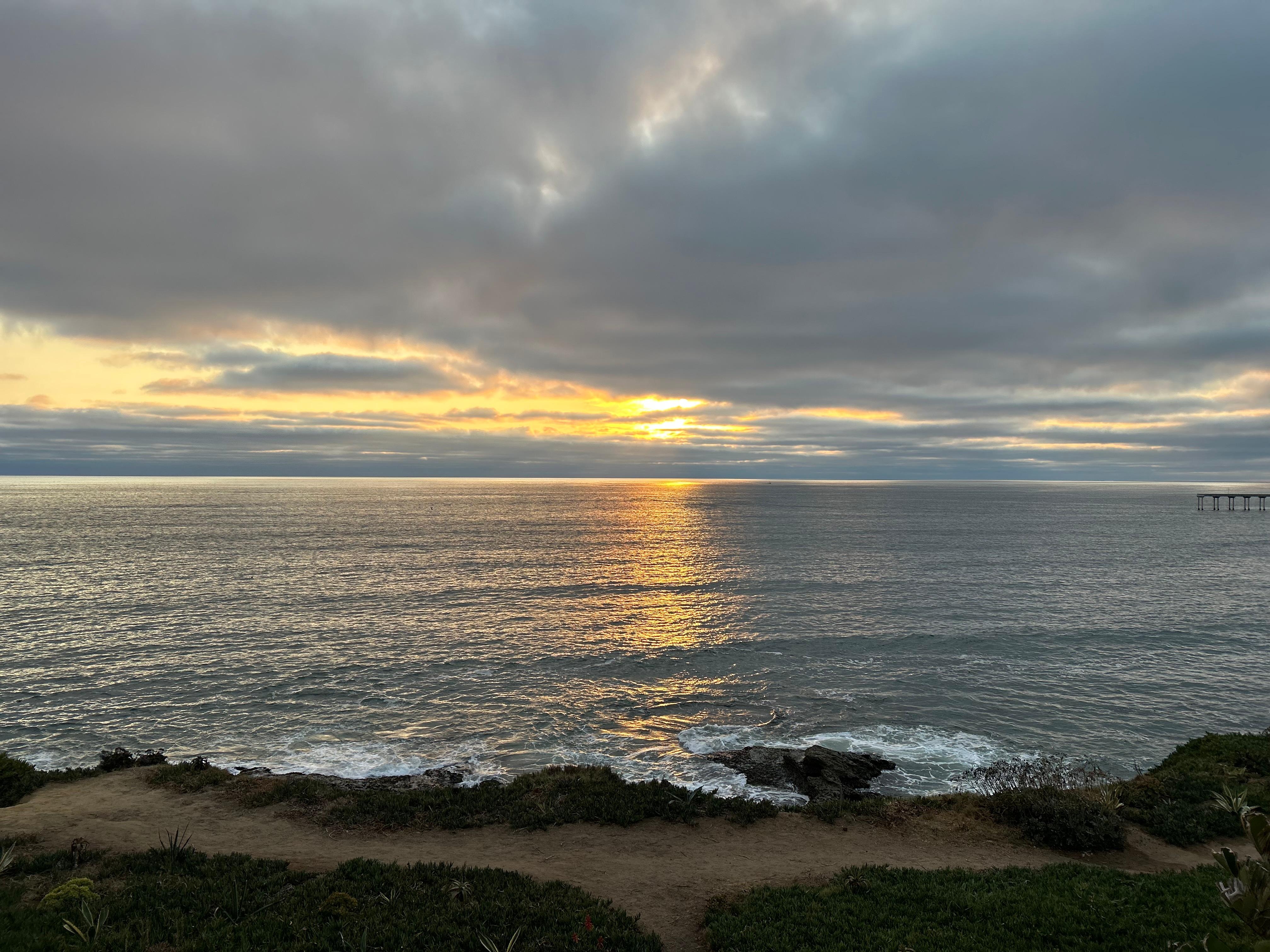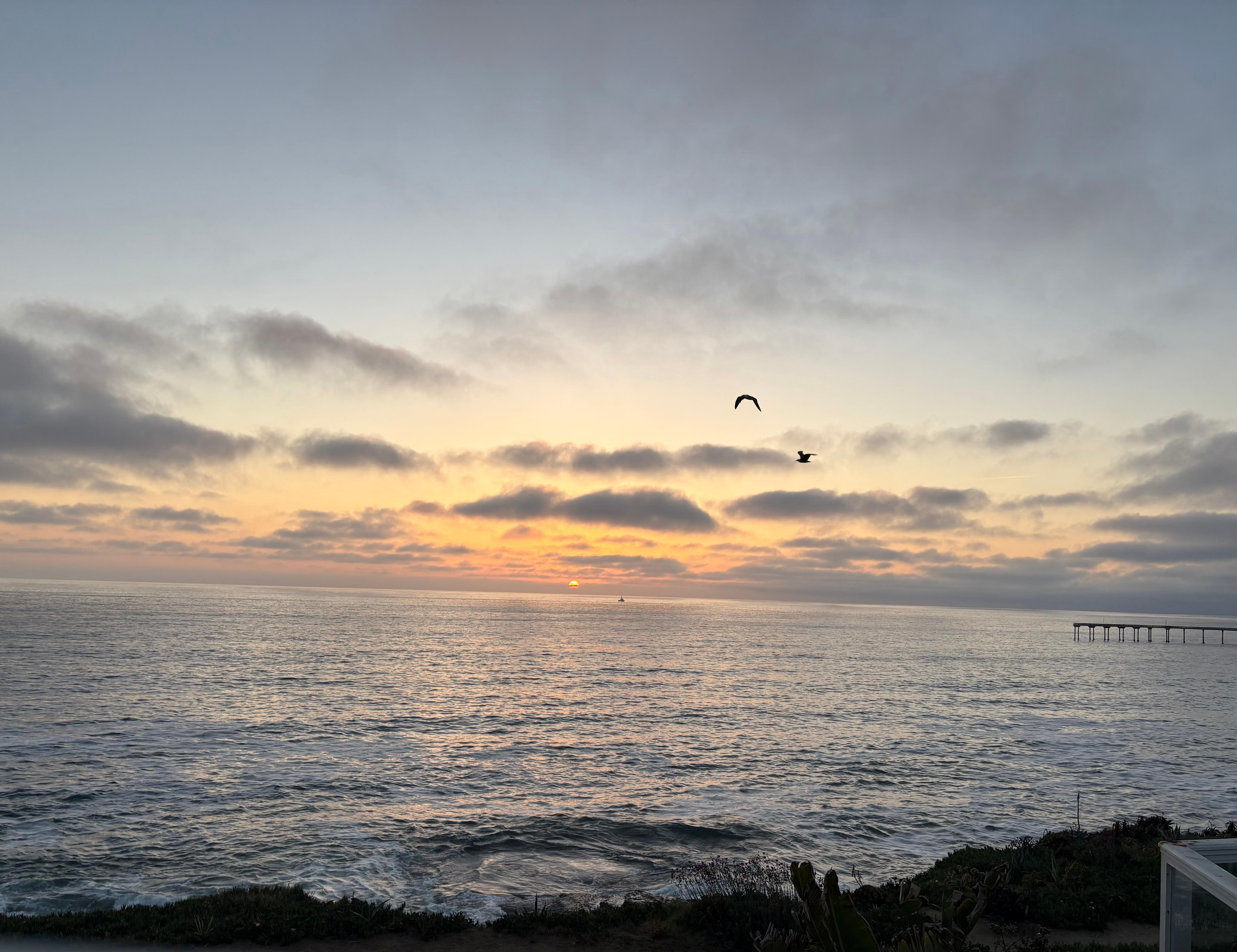 It is just a short walk down sturdy steps to explore the tide pools below or to go to a pristine white sand beach in a secluded cove. If you prefer to play in the surf at a large public beach with lifeguards, it's only a seven-minute walk. Fishing on the Ocean Beach Pier and surfers add interest to your view (and your photos)! At night, the lights of La Jolla sparkle in the distance.