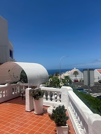 A lovely spacious 2 bed apartment sleeping upto 5 people. A large lounge that is well furnished and satellite TV, sliding doors opening onto a large terrrace overlooking the harbour of Los Cristianos. A well equipped kitchen and breakfast bar, 2 double bedrooms, one with King size bed & sliding doors opening onto the terrace with ensuite facilities & wardrobe closet. The 2nd bedroom with 2 single beds, wardrobe & plenty of drawer space. Another large bathroom with bath/shower facilities. The apartment is ideally situated on the Port Royale complex, a quiet beautifully kept complex with large swimming pool & sun area, sun lounges and umbrellas. There is an Italian restaurant on site & also laundry facilities. A good supermarket is nearby and the centre of Los Cristianos and beach only a 15 min. walk away. Port Royale has the advantage of being near a lovely harbour town but away from the day to day bustle, making it a quiet location for you to enjoy. Free late check out time available. Free WiFi availability.
