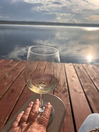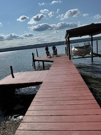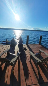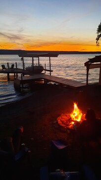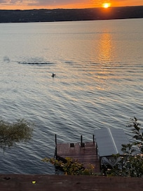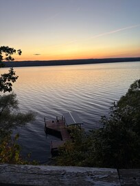This cottage is nestled at the end of the lane, below the vineyards and farm meadows, beside the lake. Three bedrooms offer queen size beds in two of the bedrooms and a double bed in the third bedroom. A modern kitchen is equipped with a full size refrigerator, stove, dishwasher, microwave, toaster, Keurig and a drip coffee maker, dishes, serving ware and a full complement of pots and pans to serve homestyle meals; including paper products, bottled drinking water and spices. Games, books, internet and TV, provide entertainment. The outdoor grill delivers delicious meals on the deck overlooking the lake. Enjoy the solitude and gorgeous views from the deck and living area windows. A newly built staircase leads to your private beach. Cliff house sits above the lake on an ancient shale cliff. Sturdy railings surround the deck and overlook areas, however, always supervise children at all times for safety. You may use our two kayaks, a canoe, life jackets, dock and beach chairs. The beach has a fire pit for evening campfires.