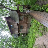 Another off the grid whimsical gem in the Ten Acre Treehouse's forest!  "The Captains Quarters" This is the second treehouse in rural Nauvoo, which will be available to rent starting May 2016!  A lot of the same touches found in "The Whitetail" the first treehouse here, You will find in this Nautical inspired creation.  This treehouse will be twice as big as the first (400 sq ft.) and features a full second story master bedroom, sleeper sofa on the first floor, small kitchen area with refrigerator w/freezer, microwave, coffee maker, plates, silverware, cups and a sink! Upon entering the treehouse you are treated to the huge map of the world as you look up in the 13' vaulted entryway.  A small window seat area creates a cozy reading area with a small collection of old books to explore!  The wrap around deck with gas grill provides a laid back environment to enjoy the panoramic views of the surrounding forest!  The second floor bedroom includes 10' vaulted ceiling which provides plenty of Windows for 360 degree views of the forest from the comfort of the queen sized bed, step out on to the balcony which features a whimsical 'outhouse' with year round compost toilet and a outdoor hot water shower while giving you a 360 degree view of the surrounding forest nearly 30' off the ground!  DEC-MAR the water may be shut off due to winter weather.  Bottled water will be provided for washing up, brushing teeth, etc.  pets are welcome with $30 pet fee.