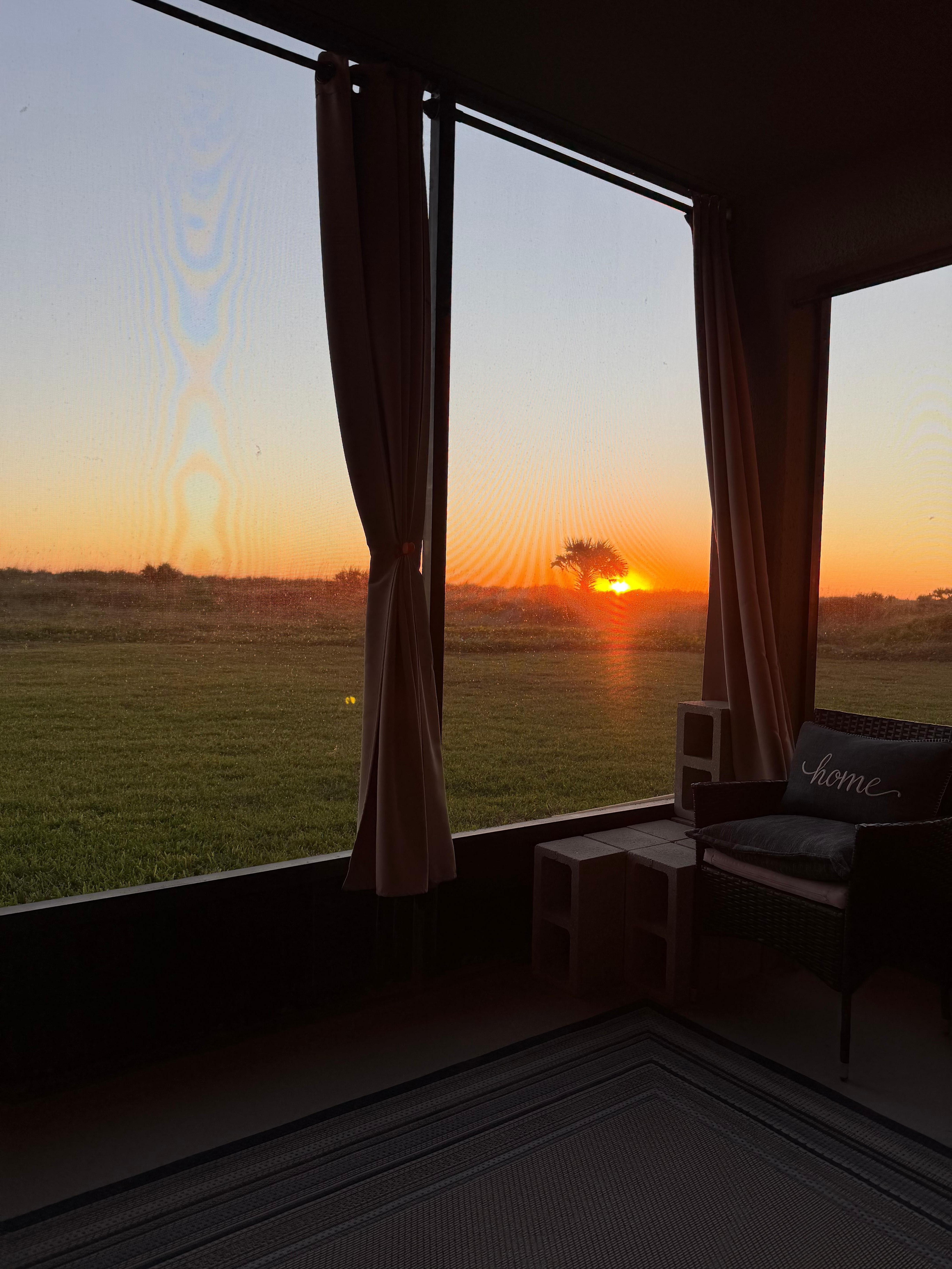 Relax on the spacious screened-in porch featuring comfy seating, a swing chair, and privacy curtains for shade and serenity.
