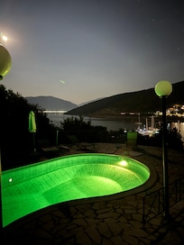 Outside, there is a large terrace offering privacy and amazing views to the harbour of Agia Efimia and the sea. The pool terrace is equipped with 4 relaxing sun beds. Pool and front terraces are surrounded by different patios with shaded relaxing areas and decorated with a variety of lovely Mediterranean flowers such as oleanders, hibiscus, jasmines, roses.