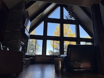 The living room offers incredible views into the forest. Who knows what birds, squirrels, deer, and other wildlife you may see from the window. Outdoor fireplace on the deck allow you to enjoy the ambience outside. A fire pit allows you to build a wood fire and make some delicious s'mores! There are other cabins nearby, but being on nearly 5 acres of land, there is no one right next to you. You can only see our two of our neighbors through the trees.