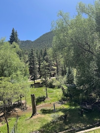 In the center of Green Mountain Falls, this lovely three-room cottage provides exactly what you need for your upcoming trip. As you step inside, you'll be greeted by a cozy living room with French doors leading to a deck that looks down on the creek. Downstairs you will find a fully stocked kitchen, complete with a stove, oven, refrigerator, grill, microwave, dishwasher, coffee maker, and all the dishes and utensils you'll need to whip up delicious meals. Unwind in the cozy living room or take a dip in the communal pool to cool off on those warm summer days. With high-speed Wi-Fi, you can stay connected and share your adventures with loved ones back home.