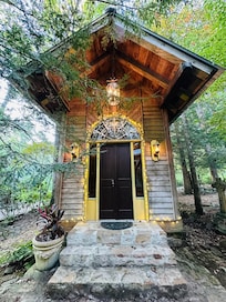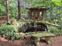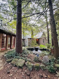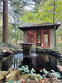 The tranquil setting includes a tea house/studio, outdoor chapel, goldfish pond, sculpted European style gardens with exotic plants and iconic figures, stone fire pit, private side porch, and other natural attractions.