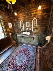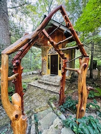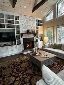 Includes free wi-fi, five smart tvs, eco-friendly washer/dryer, wood burning fireplace, gas BBQ grill, bathroom claw foot tub, scenic woodland views,etc.