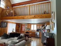 The primary suite with the adjoining loft living area is located on the second floor. The pine paneling, cabinets, and pine wood floors add to the warmth and ambiance of this Maine woods retreat. There will be the slightest sigh (ahh) of approval and excitement as you enter this gracious, welcoming environment. This is a place that can restore your soul. After a day full of activity, you can sit by the fire and watch the leaves or the snowflakes fall. In the summer, see the fireflies blink in the woods at night and listen to the loons' call. There's nothing like a swim in the clear water of Howard Pond. Relax and while away the hours in the rocking chairs on the 8'wide farmers' porch that spans the front of the house.