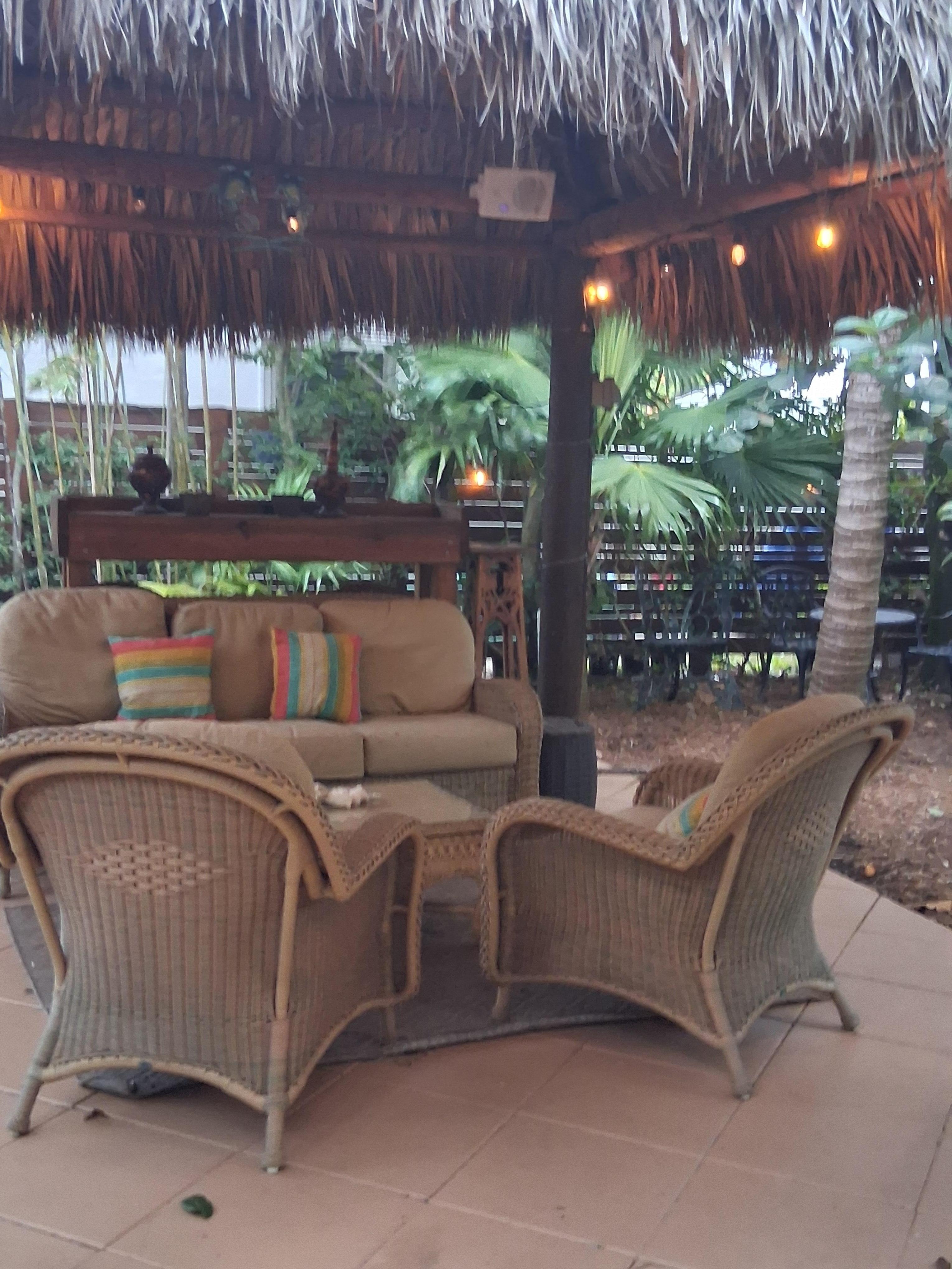 * Tiki Hut with Sofa, Loveseat and tables creates an outdoor living room.