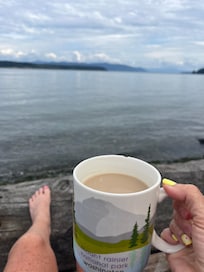 Sunrise is at the water's edge, away from the road. I love beach combing and walk the beach north to the ferry dock and south to Sunrise Cove whenever possible. Agates, shells, and sea glass our my special finds.