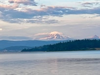 This waterfront home at the water's edge on Hale Passage with 180 degree views, looks at majestic Mt. Baker and at night the beautiful lights of Bellingham Bay.