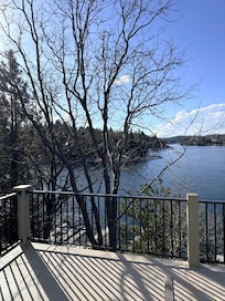 The master suite has a king bed, jetted tub, fireplace, TV and private deck with amazing views. There is a second suite with a queen bed and private bathroom. On the main floor there's a bedroom with a king size bed and lake view, also an adjacent bedroom with a queen bed. The two bedrooms upstairs are great for families with a queen and 2 twin beds.